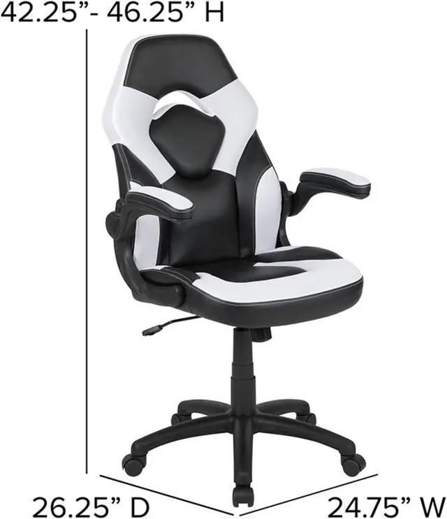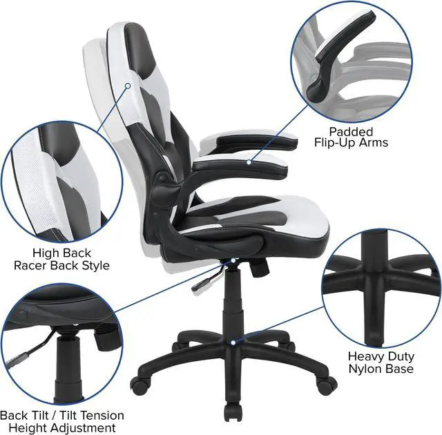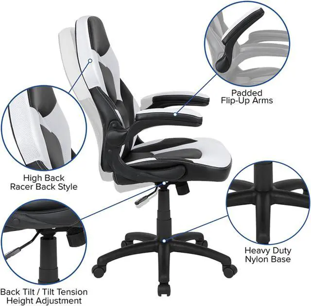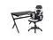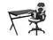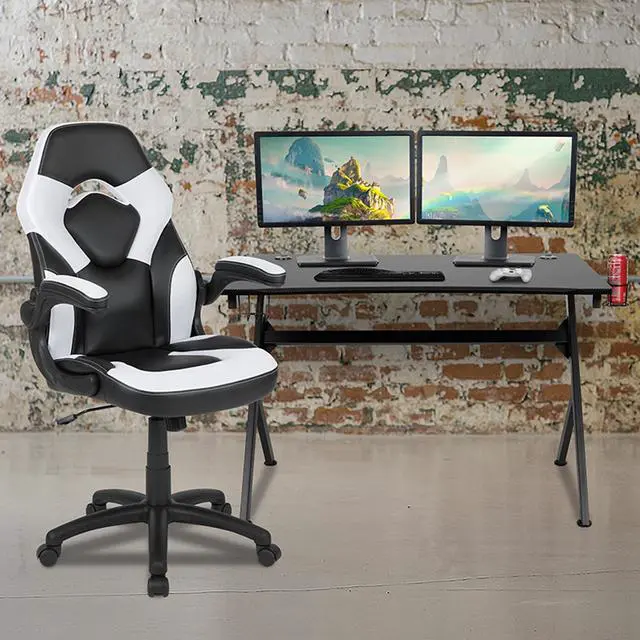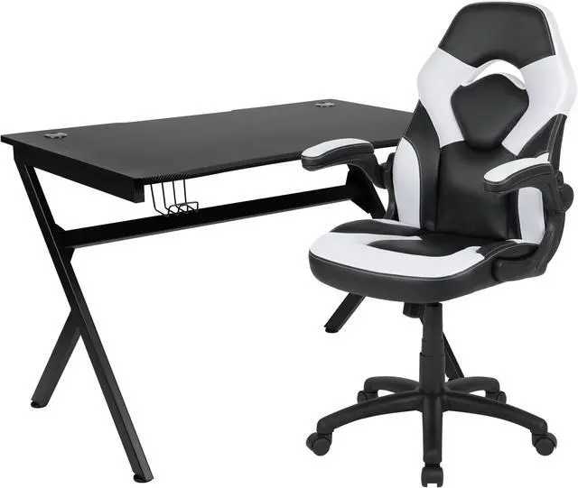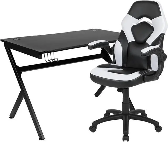 Let the games begin on this gaming desk and chair set. The black top gamers table has 2 grommets for cable management, a detachable cup holder and headset holder to keep you in game mode. The racing game chair have flip-up arms to comfortably rest your arms on while handling the controller or flip-up to slide under the desk. Be true to the gaming experience with a desk and chair combo designed for gaming systems. This PC gaming desk has a spacious, lightweight carbon fiber top that lends superior strength and prevents rust and corrosion while the low thermal expansion properties preserve fiber integrity to extend the lifetime of the desktop.