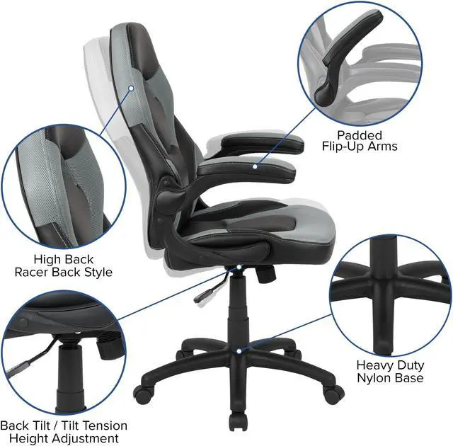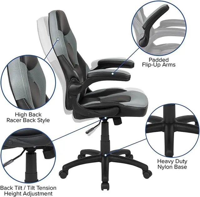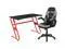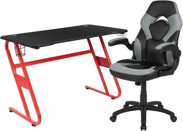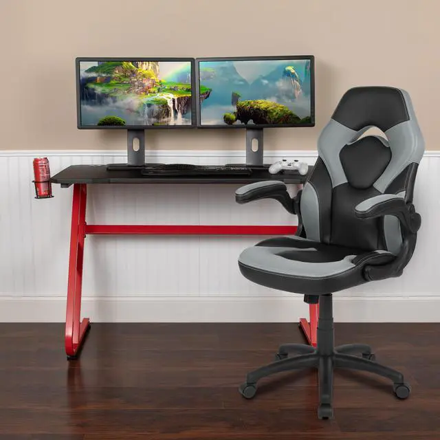 Let the games begin on this gaming desk and chair set. A sleek, red z-frame offers stability and style for a cool looking desk setup. The black top gamers table has two grommets for cable management, a detachable cup holder and headset holder to keep you in game mode. The racing game chair have flip-up arms to comfortably rest your arms on while handling the controller or flip-up to slide under the desk. Be true to the gaming experience with a desk and chair combo designed for gaming systems. A spacious desktop that can hold up to 2 monitors adds more excitement to the game.