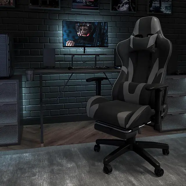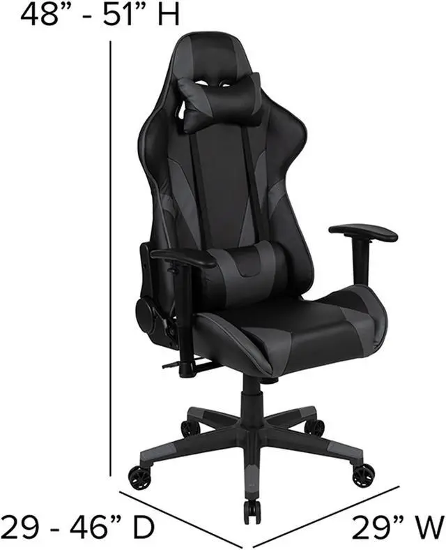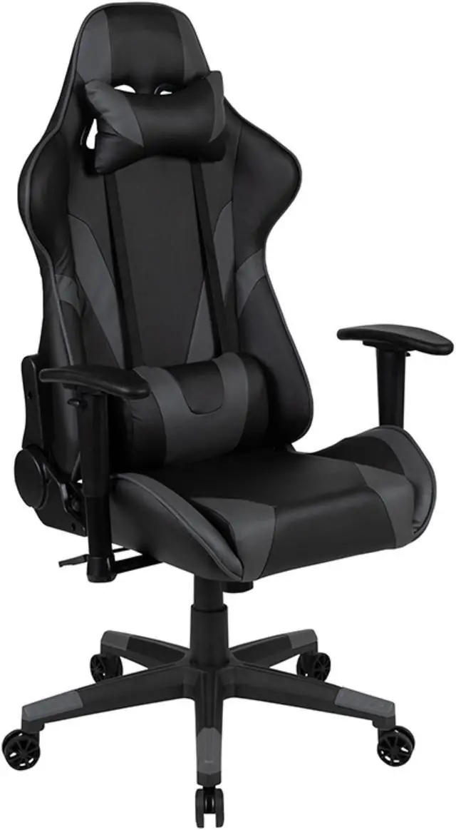 Have game day any time on your PC or with your console of choice when you own this gray racing gaming chair. Featuring a reclining back and covered in soft and durable LeatherSoft upholstery, this high back ergonomic office chair is a must have. Support for your body is key when you will be sitting for extended periods of time and this PC office desk chair has you covered. Adjustable headrest and lumbar pillows can be repositioned where you need them or quickly unsnap them if you choose to remove them. Adjustable pivot arms relieve pressure from your neck and shoulders as well as the upper body.