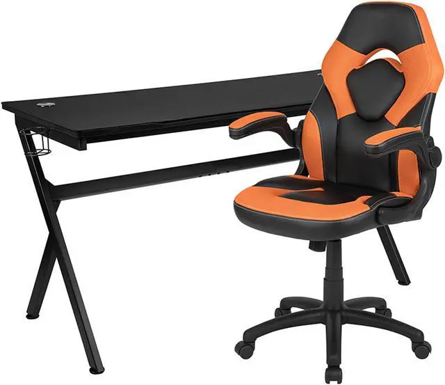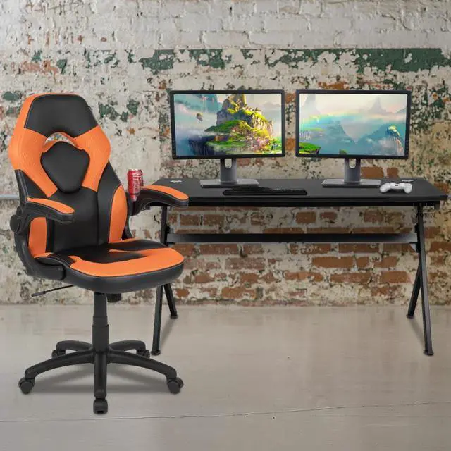 Let the games begin on this gaming desk and chair set. The extra large black top gamers table has 2 grommets for cable management, removable mouse pad top, a detachable cup holder and headset holder to keep you in game mode. The racing game chair have flip-up arms to comfortably rest your arms on while handling the controller or flip-up to slide under the desk. Be true to the gaming experience with a desk and chair combo designed for gaming systems. This PC gaming desk has ample space for dual monitors. Use the cup holder to prevent beverages from spilling on your pc gaming keyboard.