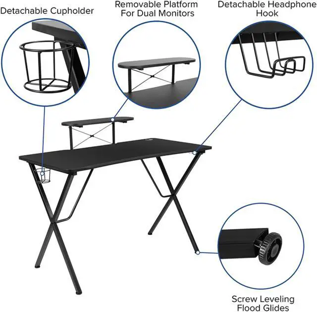 Upgrade your gaming furniture with this desk and chair bundle that offers the perfect combination at an unbeatable price. The black top gamers table can hold up to two monitors and has two grommets for cable management. Always know where your headset is with the included headrest hook while you keep your desktop and pc gaming keyboard clear of accidental spills by placing hot and cold beverages in the cup holder. Your online followers will know that you're serious when they see you in your reclining gaming chair with footrest.