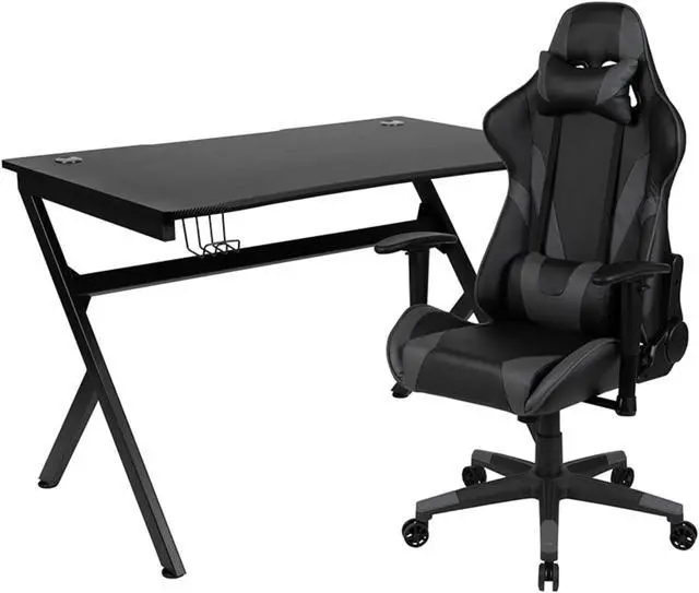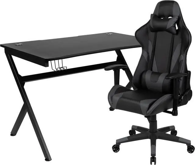 Black Gaming Desk and Gray/Black Reclining Gaming Chair Set with Cup Holder, Headphone Hook & 2 Wire Management Holes