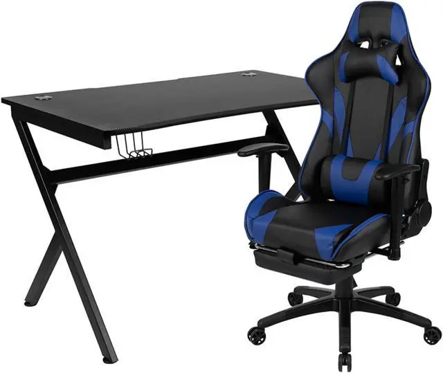 You're going to enjoy playing on this high-performance racing gaming chair with slide-out footrest. This modern gaming chair is paired with an ergonomic gaming desk. If you sit for hours in an office chair you need a gaming chair that is comfortable, and this chair includes adjustable and removable headrest and lumbar pillows. For maximum support this office chair with footrest engages by pulling the loop then flipping the footrest up to elevate your feet and has a separate lever to recline the back 87° ~ 145°. Upgrade your gaming furniture with this desk and chair bundle that offers the perfect combination at an unbeatable price.