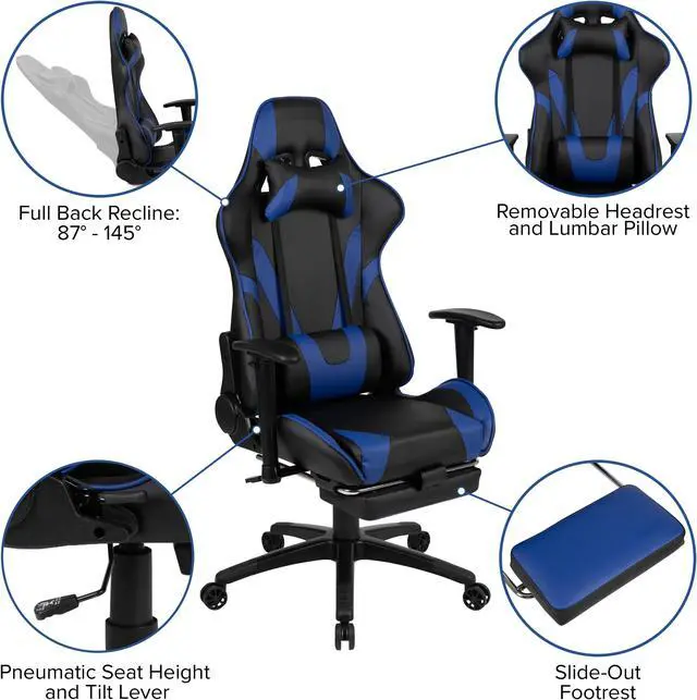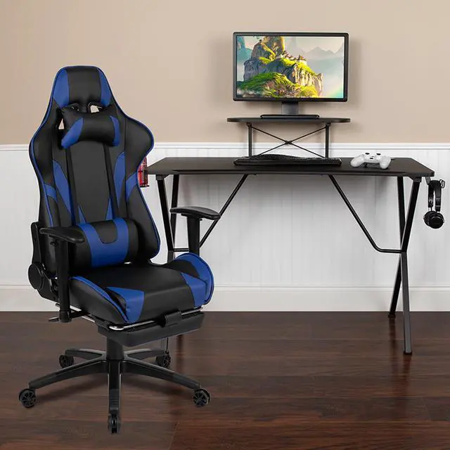 You're going to enjoy playing on this high-performance racing gaming chair with slide-out footrest. This modern gaming chair is paired with an ergonomic gaming desk that has a raised platform to reduce neck strain. If you sit for hours in an office chair you need a gaming chair that is comfortable, and this chair includes adjustable and removable headrest and lumbar pillows. For maximum support this office chair with footrest engages by pulling the loop then flipping the footrest up to elevate your feet and has a separate lever to recline the back 87° ~ 145°.