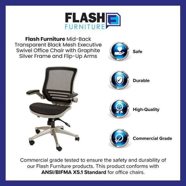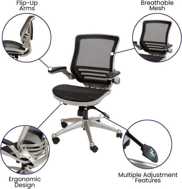 Workdays can be long and stressful which can lead to physical ailments so make sure the only grind in your day is your favorite coffee with this black executive swivel office chair with graphite silver frame. This inviting office chair flawlessly blends form and function to help you through your day. The transparent, breathable mesh material allows air to circulate to keep you cool and more productive throughout your day. A mid-back office chair offers support to the mid-to-upper back region. This mesh office chair features a contoured backrest and is ideal for anyone who does a great deal of typing throughout the day and needs good back support.