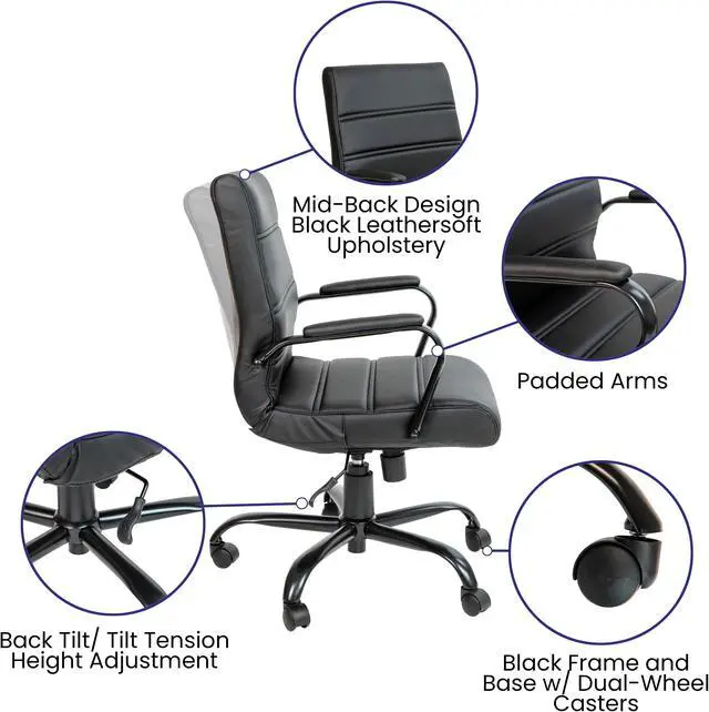 With its adjustable features, you can lean back while you take a quick phone call or lock in an upright position when it's time to focus. The knob located underneath the seat adjusts the force needed to recline. Improve the look at your desk or work area with this stylish Mid-Back Black LeatherSoft Office Chair with Black Base that is highlighted by attractive horizontal line stitching. A waterfall front edge seat reduces pressure off your legs while the armrest pads relieve the pressure off your necks and help round out the look and comfort of this chair.