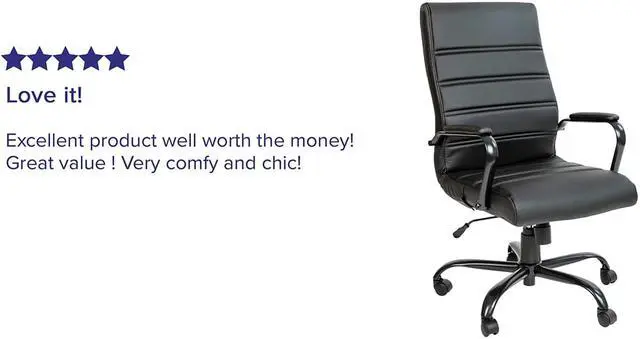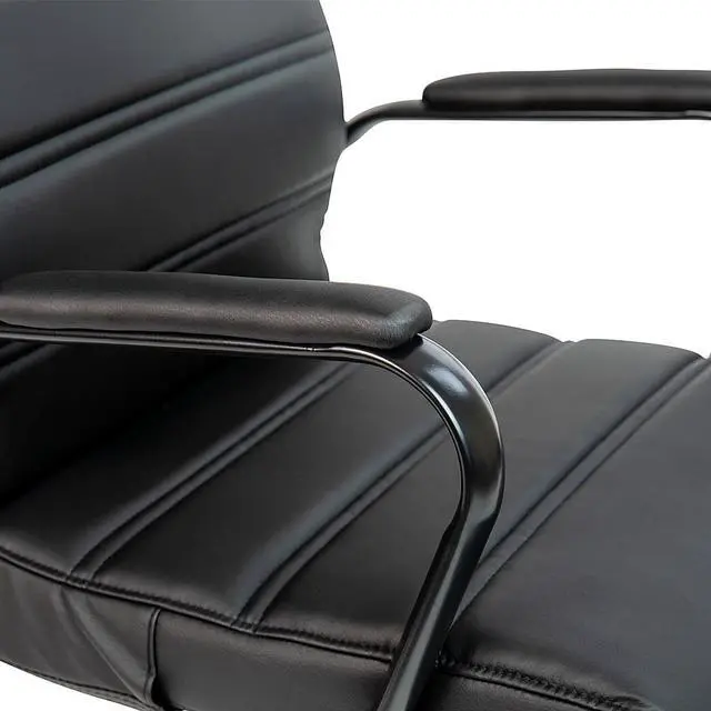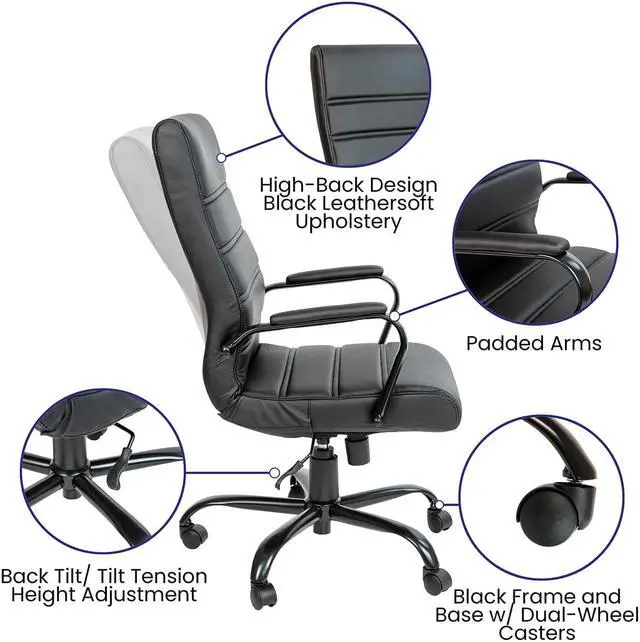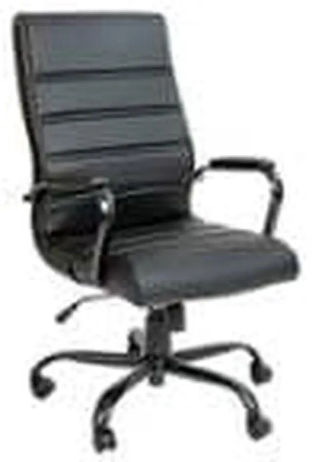 An elegant blend of comfort and style, this high-back LeatherSoft office chair is the perfect seating solution for your workspace. Crafted from black LeatherSoft material with black arms and a black base, the ergonomic design brings a sleek look with ample durability and support for long-term use. Designed for exceptional comfort, this LeatherSoft office chair features a cushioned seat and back upholstered in black LeatherSoft for softness and durability. Padding on the arms lends additional comfort, while horizontal stitching along the seat and back adds a touch of refinement. The high-back office chair features extended height to support your upper back and help relieve back tension.