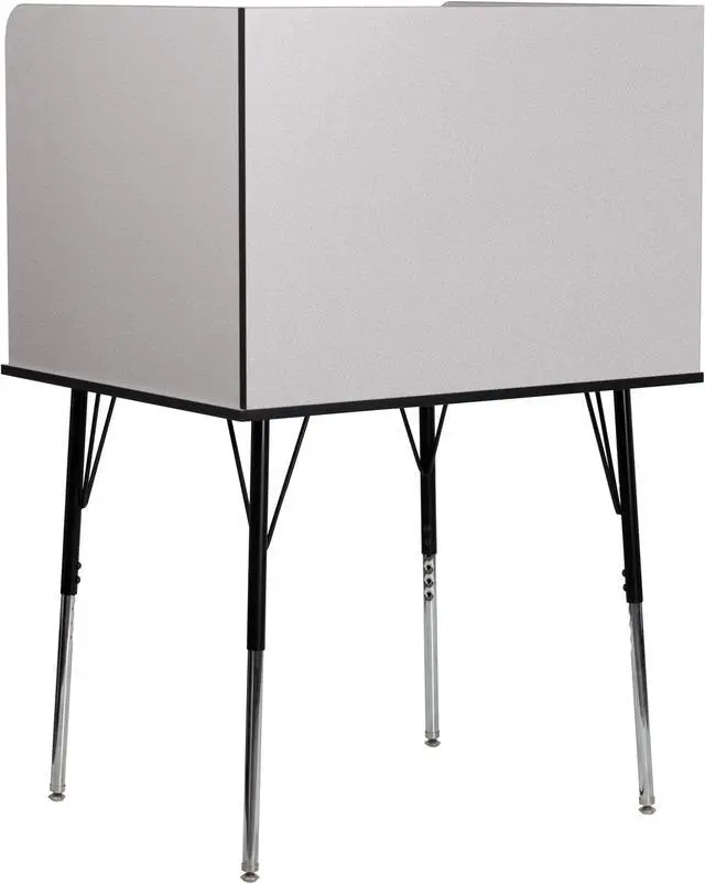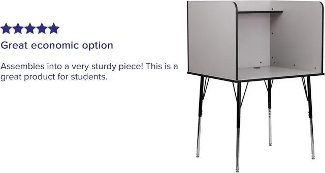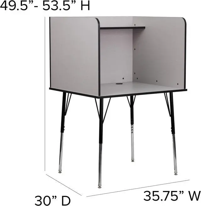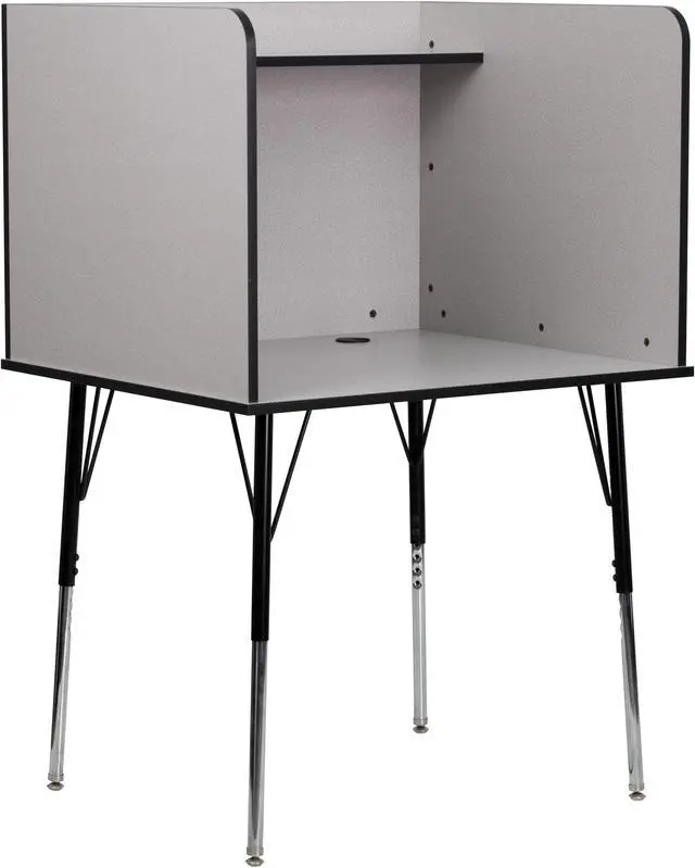 Furnish your library, commercial testing center, or computer lab with this modular study carrel for flexible study spaces to provide a quiet, private study or work area for everyone from children to adults. Whether you're studying for an upcoming exam or need a quiet space to read, this adjustable study carrel can be used in a variety of environments. The smooth laminate top boasts a nebula grey finish and is spacious enough to accommodate a laptop or flat screen monitor while the upper shelf can hold books or other supplies to free up additional work space.