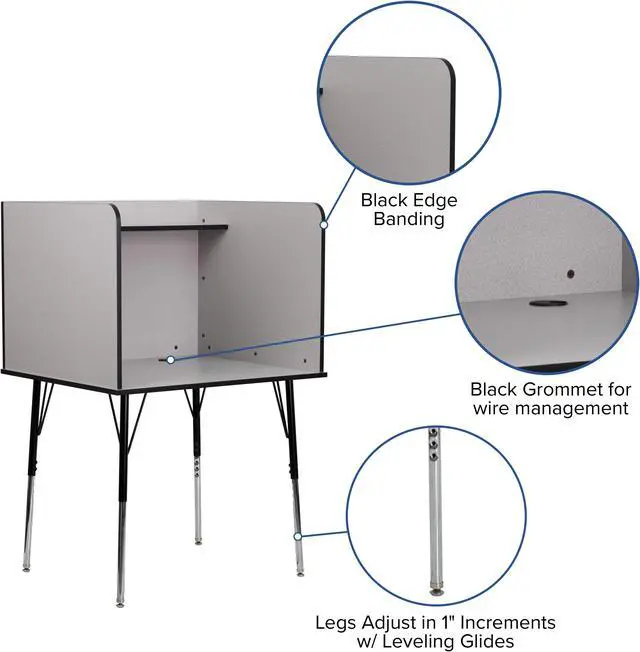 The adjustable height legs move 4 inches up or down in 1" increments making this floor carrel ideal for all grade levels from elementary to high school. Keep cords out of the way and organized with the wire management grommet. Self-leveling glides will give you a stable, level surface to complete your tasks. The solitude of a study carrel is perfect for any environment where individual concentration is required.