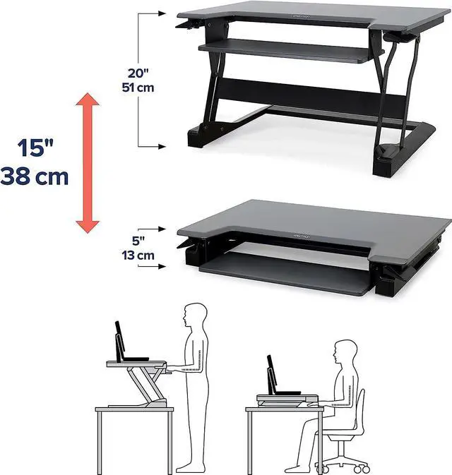 Easy, stable movement: Offers 15 inches of no-sway lift straight up and down; hand-brake lever allows for smooth, quick adjustments; keyboard and mouse tray moves in tandem with worksurface and is positioned 4.5 inches below it, maintaining proper ergonomic spacing