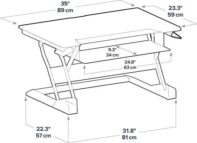 Large worksurface: 35 x 23-inch worksurface comfortably supports two monitors or a monitor and laptop; easily accommodate a standard keyboard and mouse on the 25 x 9-inch keyboard tray; supporting 10 to 35 pounds, this desk effortlessly holds all the essentials