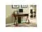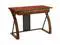 Rustic medium oak veneer; black powder-coated accents; pull-out keyboard tray