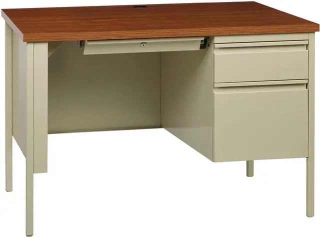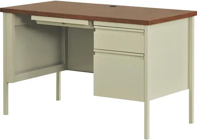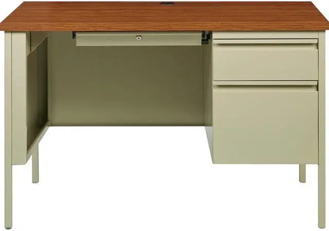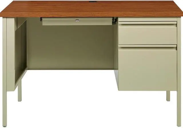 45-1/2" wide single-pedestal desk is part of the Lorell Fortress Series, a practical and professional desk solution ideal for business, government and educational offices. Use this right-pedestal desk with a Fortress left return for L-shaped configurations. Both have 3/4-height modesty panels for seamless lines. Durable, high-performance steel construction stands up to rigorous daily use. The 1-1/8" thick top with square edges features an Oak laminate surface that is scratch-resistant, stain-resistant and water-resistant. Design also features a box/file pedestal on the right. Both drawers lock and offer full-extension, ball-bearing slides and full-width, integrated drawer pulls. File drawer accommodates letter-size files. Central-locking center drawer features a core-removable lock. Center grommet allows easy cord management. Reinforced, double-frame inner structure keeps desk solid and sturdy for years of use. Steel desk meets or exceeds ANSI/BIFMA standards.