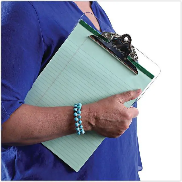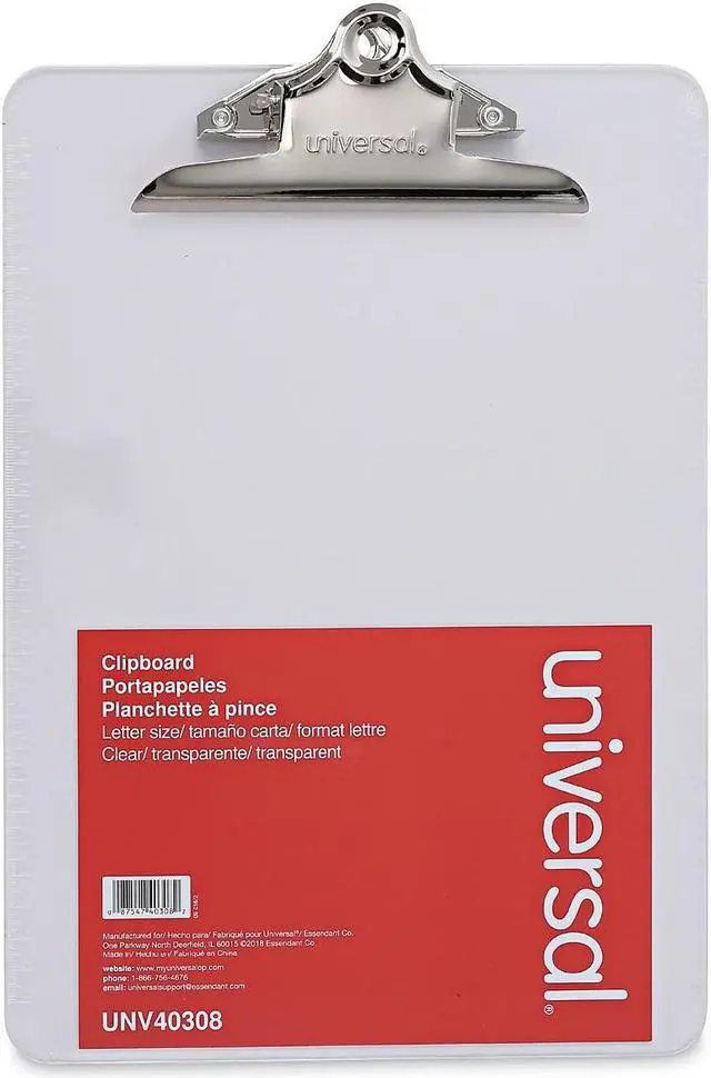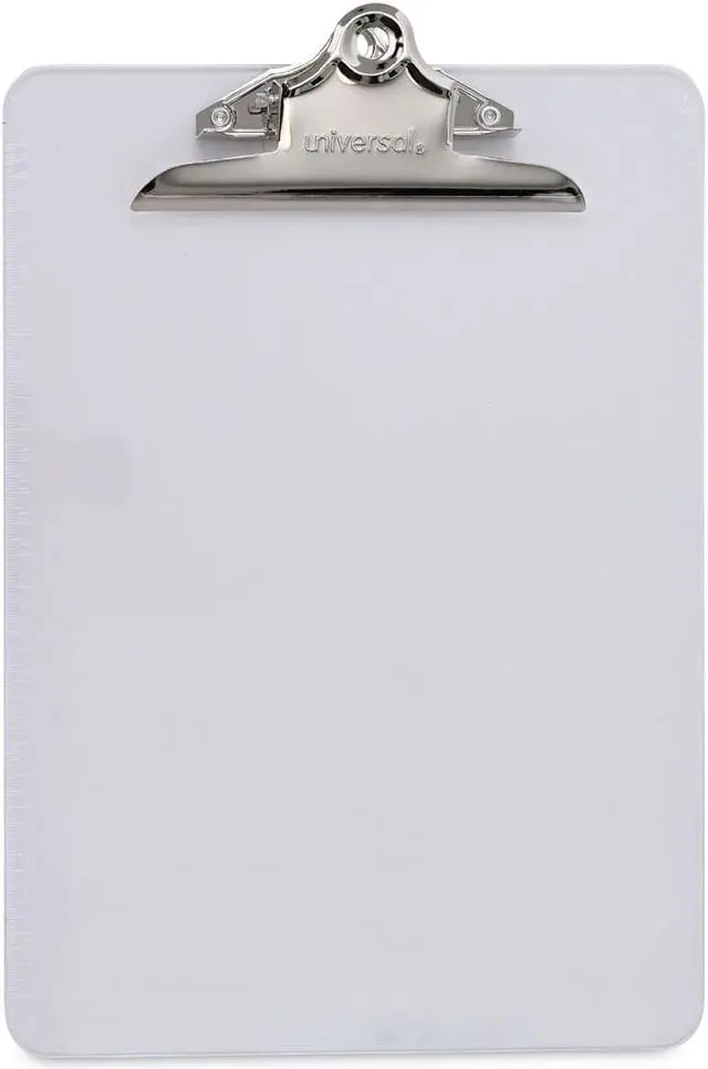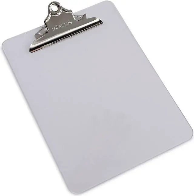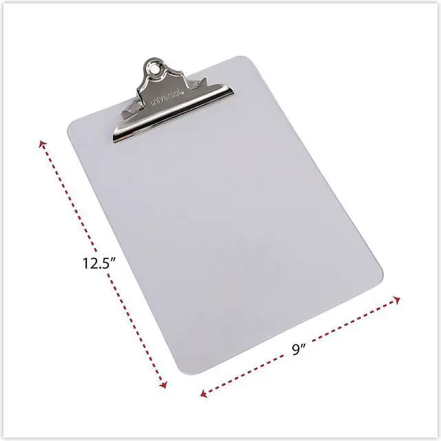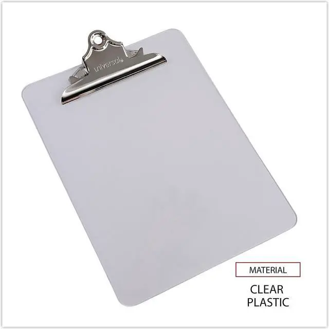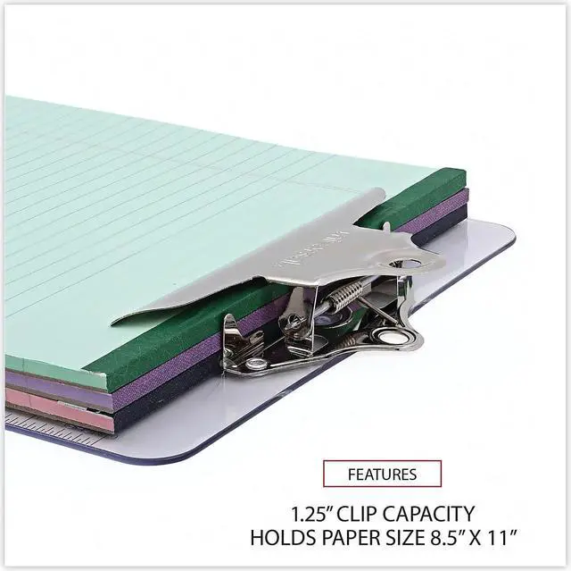 Features durable plastic construction and built-in hanging hole. Attractive transparent board material available in three popular colors. Variety of colors allows for visual identification by project or department. Holds Paper Size: 8 1/2 x 12; Clipboard Actual Size: 9w x 12 1/2h; Clipboard Material: Plastic; Clip Capacity: 1".