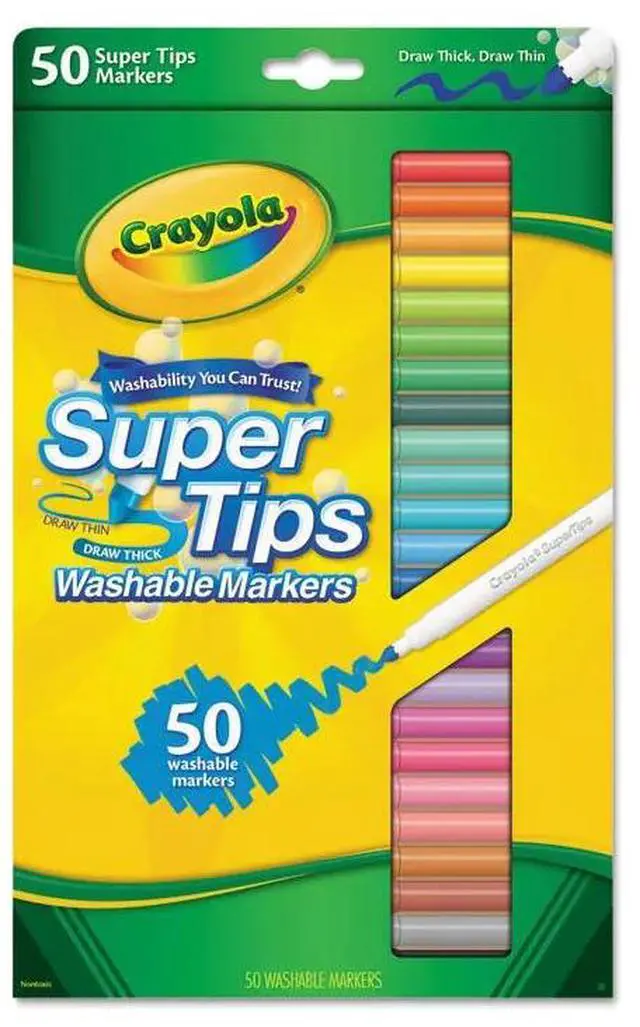 Great for any creative project, Crayola Markers have a durable tip that is smooth not scratchy. Super Tips are a unique coloring tools because of their specially designed marker tip, which can be used to create thick and thin lines. This makes them a preferred tool for practicing hand lettering and creating detailed DIY crafts. Pair this set with a Crayola Coloring Book for a great gift idea. Its perfect for birthdays, holidays and everyday creative play. Marker Ink Type: Washable; Marker Tip Type: Bullet; Marker Tip Size (text): Fine/Broad; Marker Color(s): Assorted.