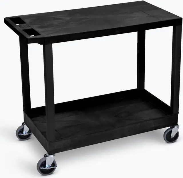 Look to this Luxor utility cart for heavy-duty versatility. Capable of holding and hauling up to 400 lbs., it boasts a dual-shelf design with one 2.5"-deep tub shelf on the top and one thick flat shelf on the bottom. Both shelves are made from rugged thermoplastic resin that won't scratch, dent, stain or rust. And 4" rolling casters two fixed casters and two full-swivel casters with locking brakes make this heavy-duty cart easy to move when transporting heavy loads. Includes one 2.5"-deep tub shelf and one 1.625"-thick flat shelf with .25" retaining lip to secure items from sliding off. Shelves and legs are constructed of an injection-molded thermoplastic resin that will not stain, scratch, dent or rust. HDPE (high-density polyethylene) shelves; PVC legs.