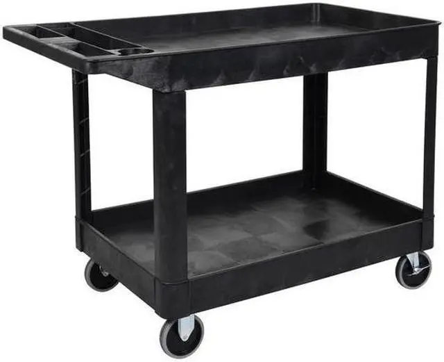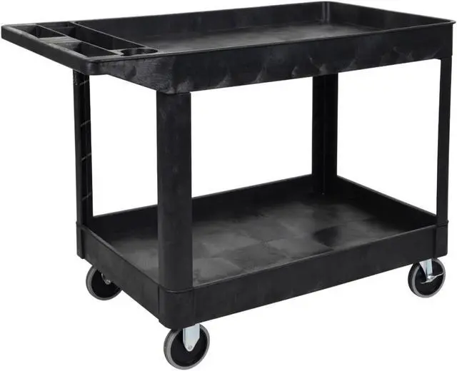 The XLC11-B, an extra-large and heavy-duty version Luxor's two-shelf plastic utility carts, is perfect for organizing and hauling your bulkiest and heaviest items. The pair of spacious tub cart shelves are 5"-deep to contain an assortment of items securely. At 24.5" wide and 45.5" long, this rolling cart offers impressive capacity while still being maneuverable in narrow aisles. Made from high-density polyethylene plastic, the rolling cart won't dent, rust, scratch, or stain and can hold up to 500 evenly distributed pounds. An ergonomic push handle and 5" commercial-grade casters, two with locking brakes, make it easy to move heavy loads and stabilize the cart when needed. To add even more storage and functionality, this XLC11-B includes a pair of Luxor's Outrigger Utility Cart Bins, which enhance convenience and efficiency by adding a combined 6 gallons of versatile, removable, supplemental capacity. Perfect for bottles, tools, hardware, restaurant and hotel supplies, and much more, the Outrigger storage bins easily slide over the lips of the tub-style shelves. Features of these utility bins include a 25 lb.