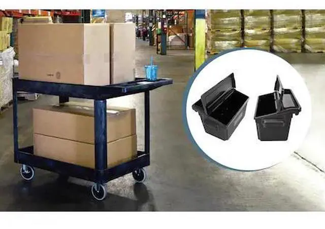 Color: Black. Twin tub shelf design suits warehouses, shops, garages, restaurants, hotels, or offices. Molded plastic shelves and legs will never rust, dent, scratch, or stain. High-quality storage bins easily slide onto the lips of most utility carts with tub-style shelves. Also available as a bin-only 2-pack that includes two lids. Tub Cart Dimension: