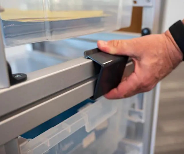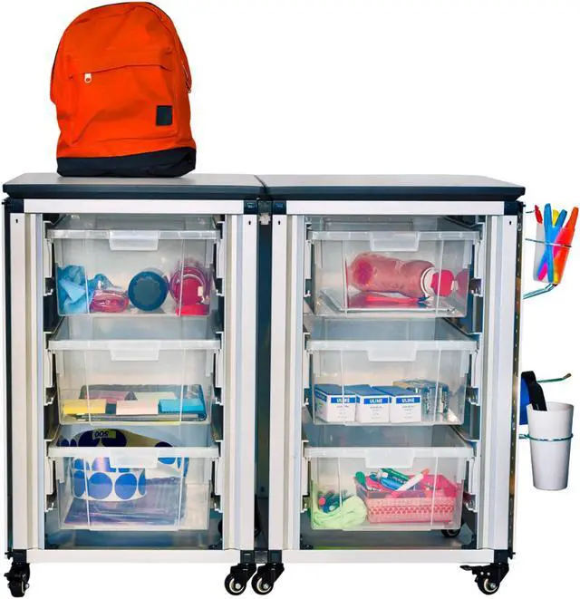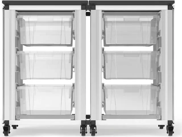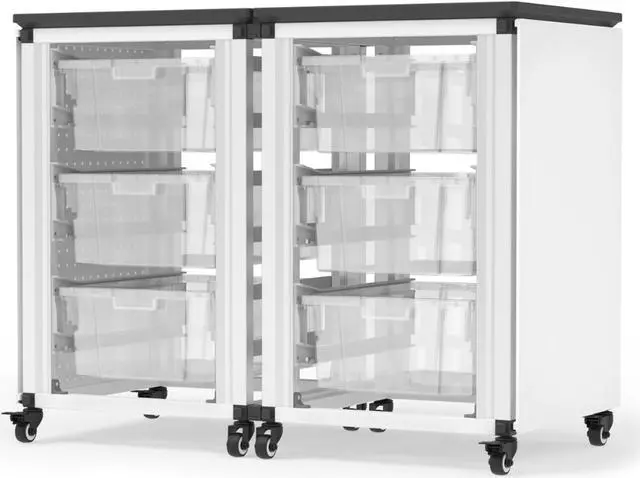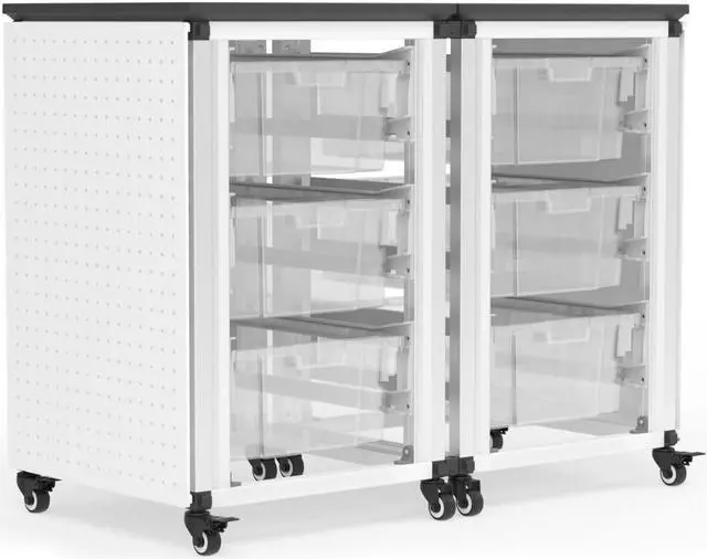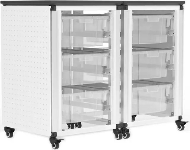 Luxor's Modular Classroom Storage Cabinet offers an ideal solution for the organization and safekeeping of essential educational materials. Customizable, expandable, and sold in a full range of configurations, there's a model to suit the needs of any learning space perfectly. Highlights include a removable whiteboard side panel, a removable pegboard side panel (perfect for organizing STEM and maker space supplies), sturdy MDF tabletops that add usable work and storage space, plus smooth-rolling, lockable casters that make transporting supplies between classrooms easy. Best of all, the system features Luxor's MBS-series removable and stackable storage bins, which make it a snap to keep classroom supplies readily at hand as teachers move from room to room and students transition from activity to activity. Depending on the cabinet model you select, you get a choice of 6"-deep bins, 3"-deep bins, or a combination of bin sizes. The bins are cross-compatible with other Luxor MBS-series products, such as our MBS student desks, student chairs, teacher cart, or activity table (sold separately). Easy to assemble, each cabinet module holds up to three 6"-deep storage bins, six 3"-deep storage bins, or a combination of the two sizes. Based on your needs, choose from configurations that are stacked two-high, connected side-by-side, connected back-to-back, as well as a combination of vertical and horizontal connections. All models include an extra set of horizontal connection hardware (for side-by-side and back-to-back connection of additional modules) in case your needs expand in the future. Each module lets you organize and stack supplies in six removable 3"-deep bins, or three removable 6"-deep bins. Steel frame for durability. Bins are made of clear plastic, making it easier to see their contents. Built-in safety feature prevents bins from accidentally pulling off their tracks. Bin handles include ticket inserts for standard labels. Tabletop surface provides a supplemental work area. Included dry erase whiteboard side panel for sharing of ideas. Included pegboard side panel provides additional option for organization of supplies. Compatible with standard pegboard hooks, loops, and bins. Modules depending on model - can be stacked, joined side-by-side, and joined back-to-back. Included hardware ensures secure connections between modules. Four casters allow smooth maneuverability; two locking brakes offer stability for stationary use. Additional storage bins are available in packs of eight small or four large tubs. NOTE: All cabinet configurations come complete with an extra set of horizontal connection hardware (for side-by-side and back-to-back connection of additional modules). If you wish to have modules that stack vertically.