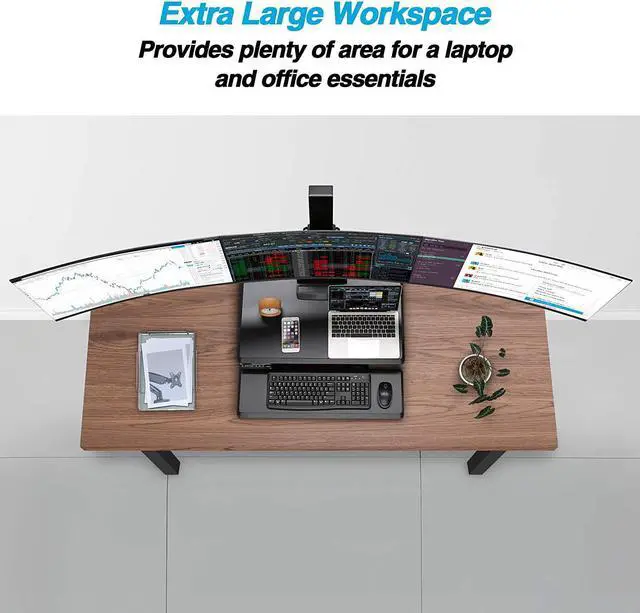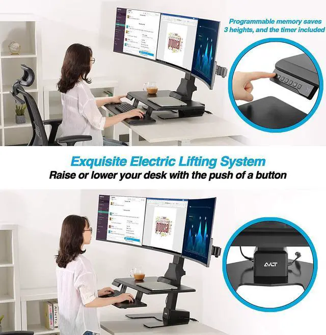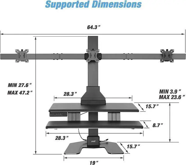 TRIPLE 32" MONITOR SUPPORT Mounts up to three 13.2 pounds 32" VESA 75x75mm 100x100m Compatible Monitors Tilt 45 degrees and Swivel 30 degrees for your Monitors Height adjustable monitor mounting bar with 15 degrees swivel for a surround monitor setup DIGITAL CONTROL PANEL Digital Adjust Control to Raise & Lower the electric standing desk frame 3 Programmable Height to Memory and highly suitable for people who cannot use gas spring sit stand workstations under normal conditions Beeper function for reminding you when to begin standing or sitting EXTRA LARGE KEYBOARD TRAY Large Keyboard Tray with a 28.3" x 8.7" surface are accommodates a full-size keyboard and plenty of space to use your mouse Total work surface capacity lifts up to 55 pounds SPACE SAVING BASE Free up more space on your table with a minimalist and sturdy 19" x 15.7" standing base The efficient 29W motor is also situated here at the base to deliver direct lifting power to the standing desk converter