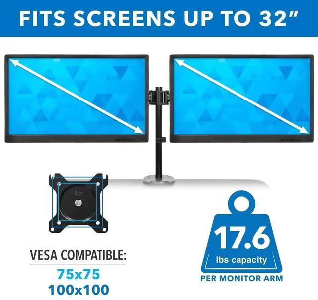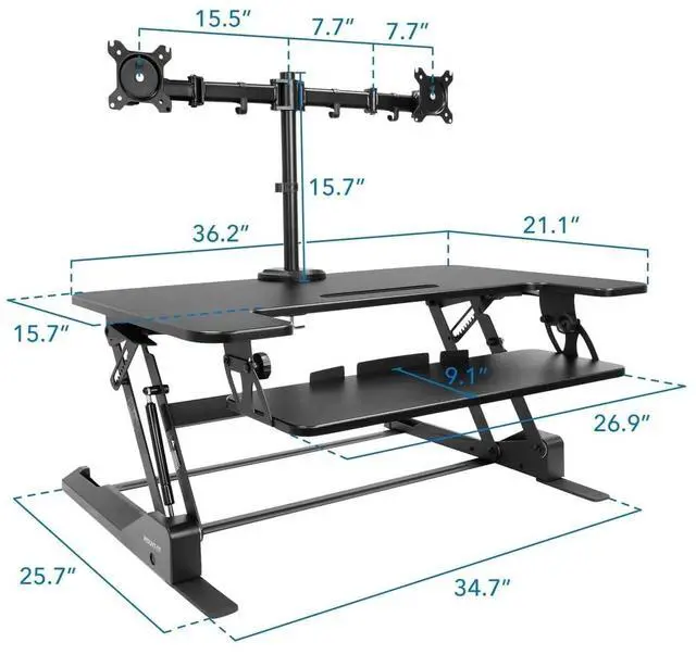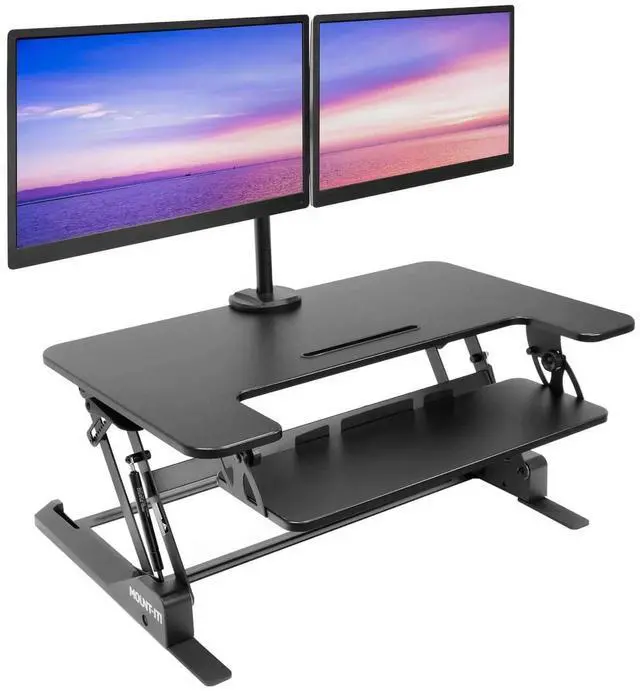 The MI-7934 sit-stand desk converter will turn your desk into an ergonomic workspace and can hold two monitors to maximize your efficiency. The adjustable dual monitor mount allows you to position the screens to fit your needs. Reduce eye strain and glare by tilting the monitors to find the perfect angle. Rotate your screens between landscape and portrait to suit your working needs. The large surface holds all your office essentials. Nonskid pads helps protect your desk from scratches. Integrated cable management keeps your desk tidy and organized.