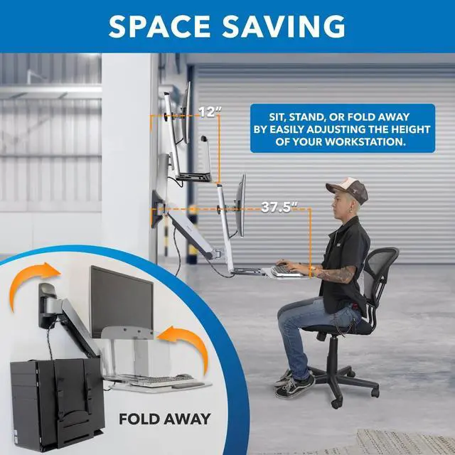 Mount-It! Sit-Stand Wall Mount Workstation MI-7905 Mount-It! MI-7905 offers a complete workstation that saves space and promotes health. Move from sitting to standing in mere seconds with our easy-to-use gas spring arm system. Be more productive, focused, and less stressed in this new working style. Monitor height can be independently adjusted to suit users with different heights. The large keyboard tray can fit a full size keyboard and mouse. Additional accessory tray provides dedicated slots for office stationary, smart phones, and cupholder for your drink. All necessary instructions and hardware included.