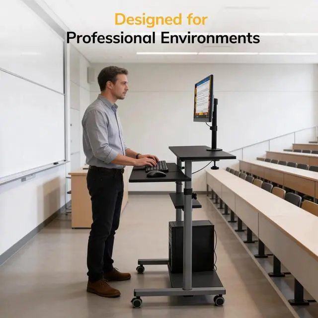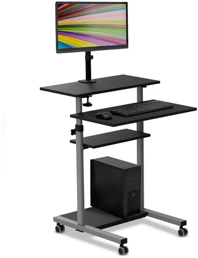 This sleek workstation is made with a high-quality steel frame and is carefully designed with platforms that provide plenty of space for monitors, keyboards, a mouse pad, a PC tower and a printer. Use with or without the included monitor arm for an ergonomic layout. The locking casters allow the cart to be stationary or mobile when you need it to be, and 17" of height adjustment supports sitting and standing at 11 locking intervals.