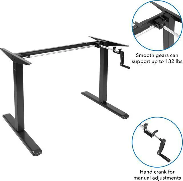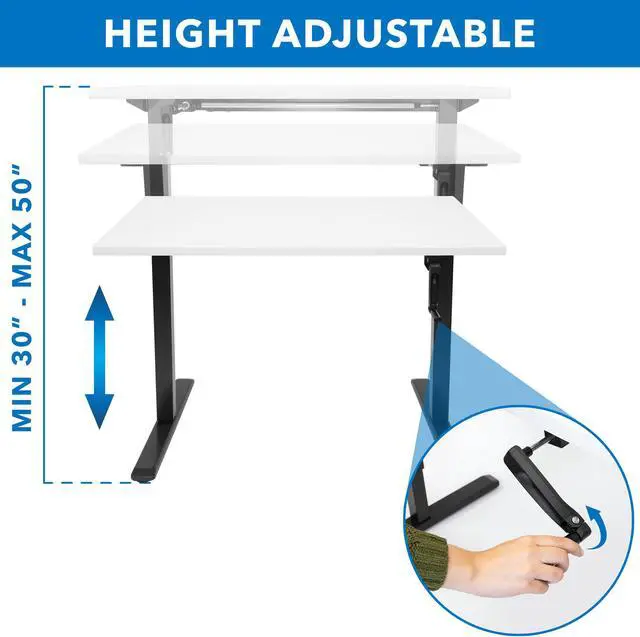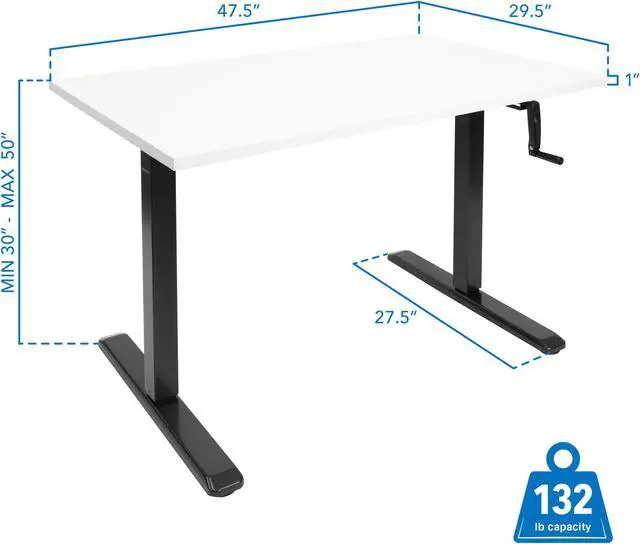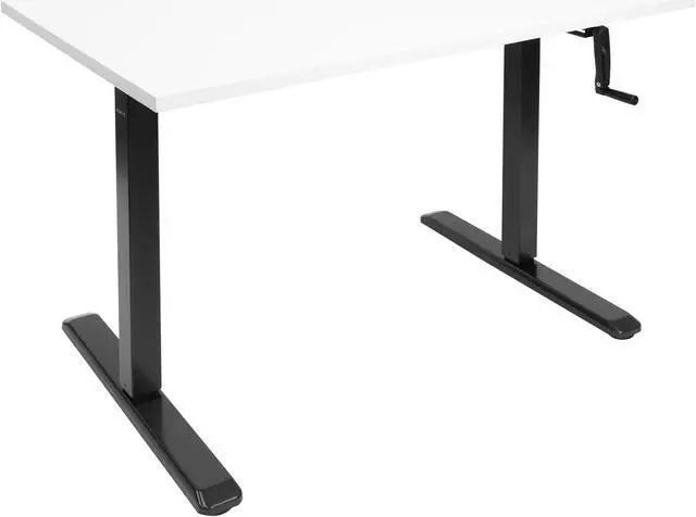 Upgrade to a sit-stand desk and improve health and productivity while you work. This compact desk with black frame and a 48" white tabletop enhances any type of workspace at home or in the office. Easy to use crank system adjusts the height of the desk between sitting and standing positions and makes this desk affordable and maintenance-free. The solid steel frame provides a durability that is sure to withstand heavy and repeated use. Say good-bye to the negative effects of sedentary work and enjoy an ergonomic workplace anywhere without the need for electricity.