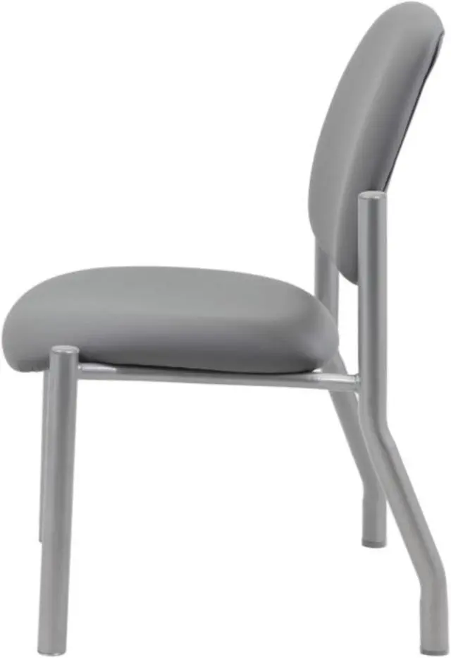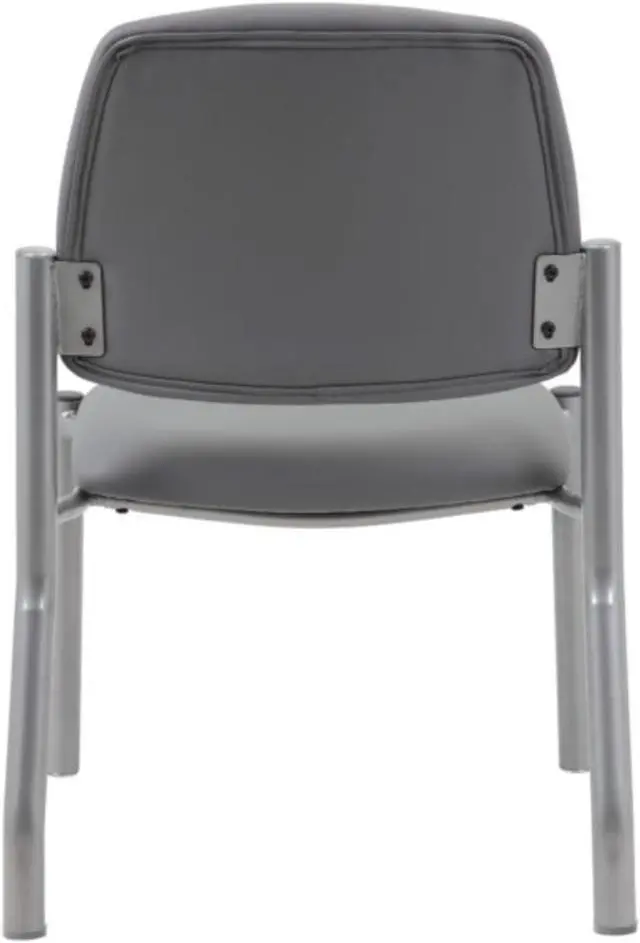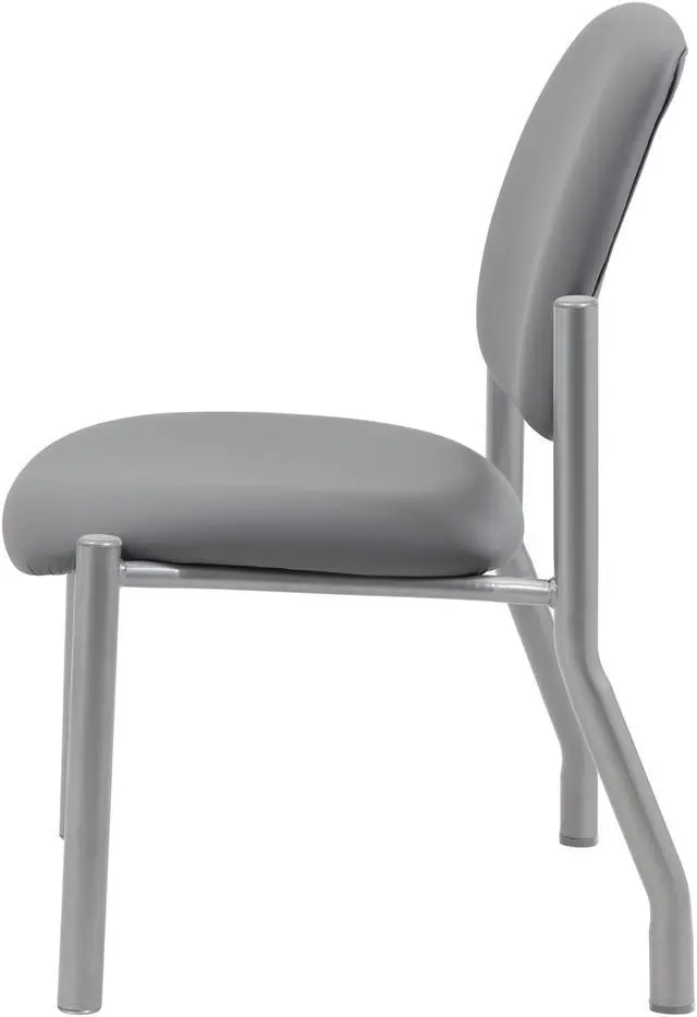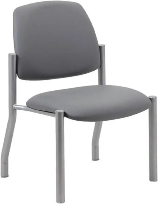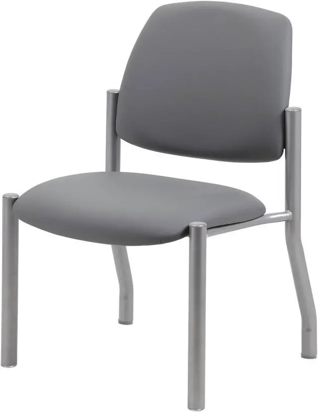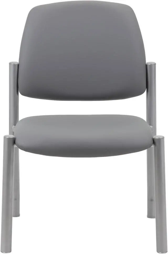 This heavy duty and comfortable mid back guest chair is perfect for anyone seeking additional seating in any room or office. The guest chair is designed with a strong and easy to clean antimicrobial grey vinyl material that lends a professional appearance along with a sturdy four leg tubular silver steel base that offers coziness and strength. The chair stands at a fixed height with an streamlined armless design and boast a weight capacity of 300 lbs.
