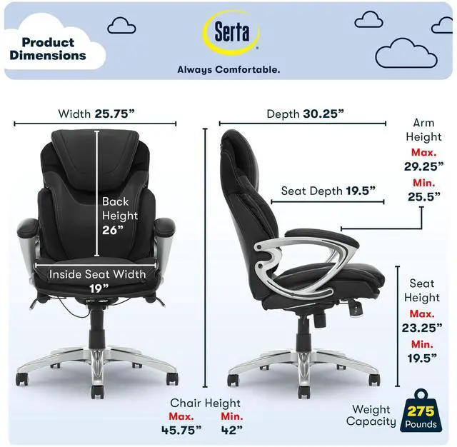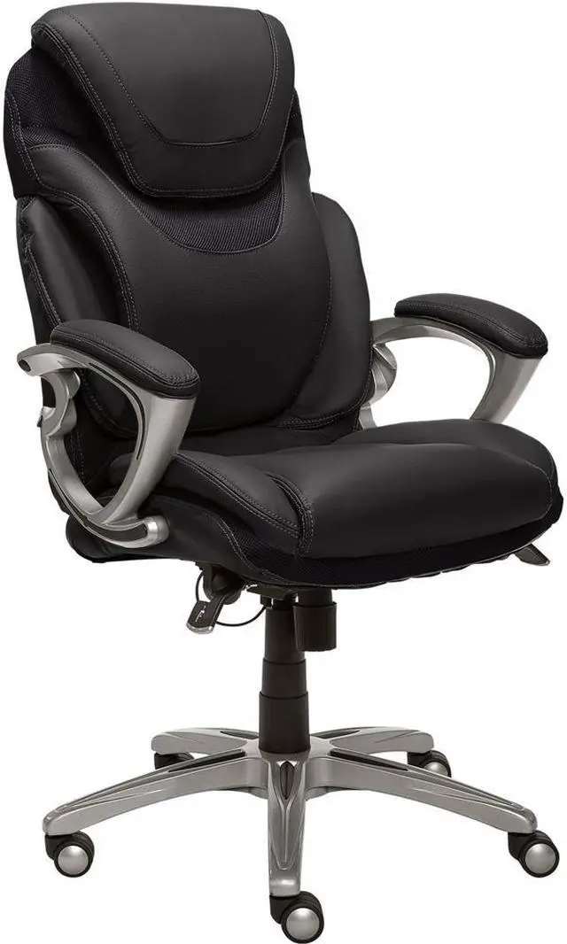 Lumbar support; swivel mechanism; tilt lock; tilt tension adjustment; breathable; headrest; cushioned seat; bonded leather material; 5-pointed star base; padded armrests