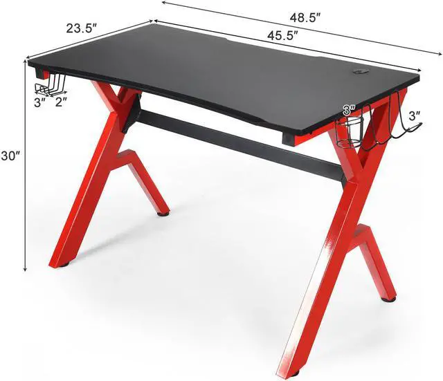 This is our brand new professional gaming desk which is a perfect choice for your enjoyable gaming time! It features large gaming desktop that can withstand 220 lbs of weight, providing ample room for your monitor, PC, laptop, speakers and more.PVC carbon fiber surface is scratch-resistant and easy to clean, reveals excellent performance to allow you to enjoy gaming in enough space. Equipped with a cup holder, a headphone hook and two controller stands, the E-sports table will keep all of your gaming gears organized and be convenient for your daily needs. R-shape frame constructed with steel pipes ensure the stability and durability of the table, accompanying you to enjoy your time in playing games. Good in quality and comfortable for usage, the gaming desk is really worth buying!