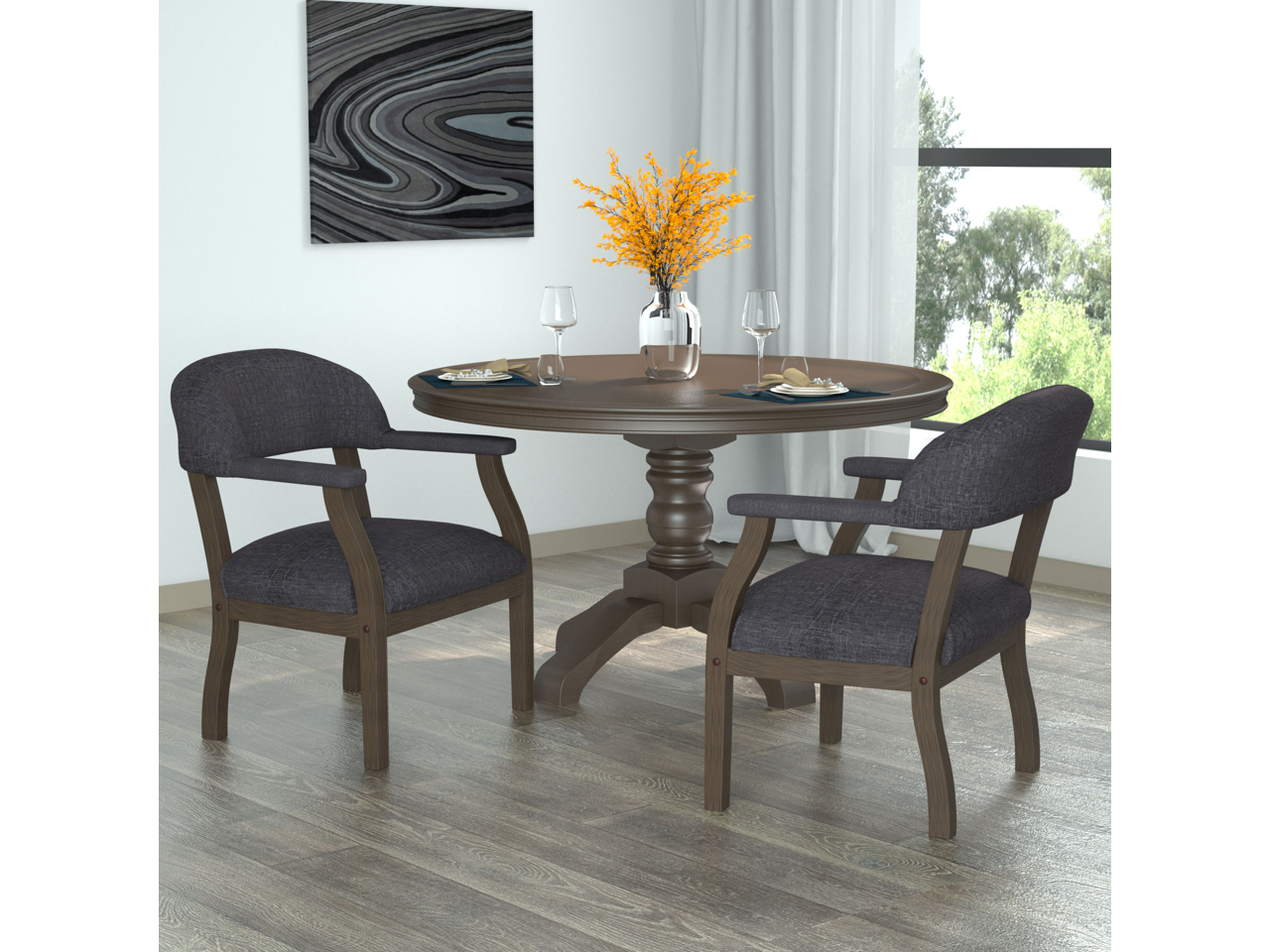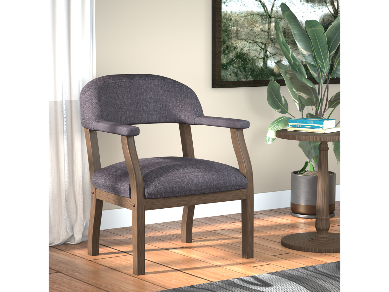 It features a hardwood frame and complementary natural grey fabric for an alluring and professional feel that is sure to pair beautifully with the surrounding decor