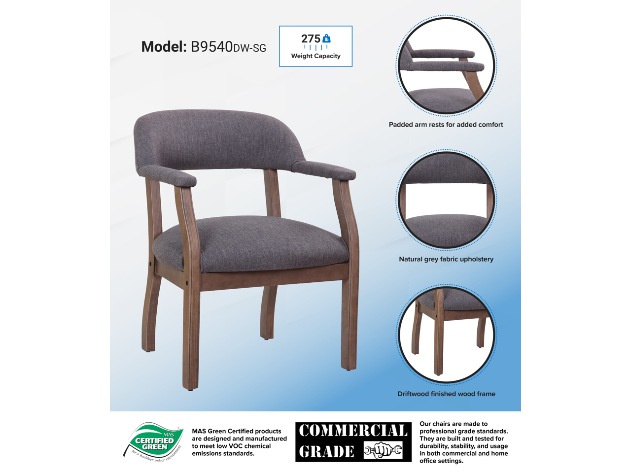 Additional features include padded arms, efficient back support, and comfortable no-sag spring seat all of which ensure a relaxing experience for your guests and visitors