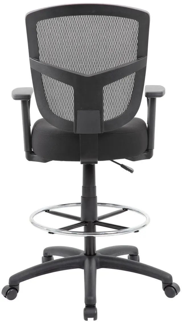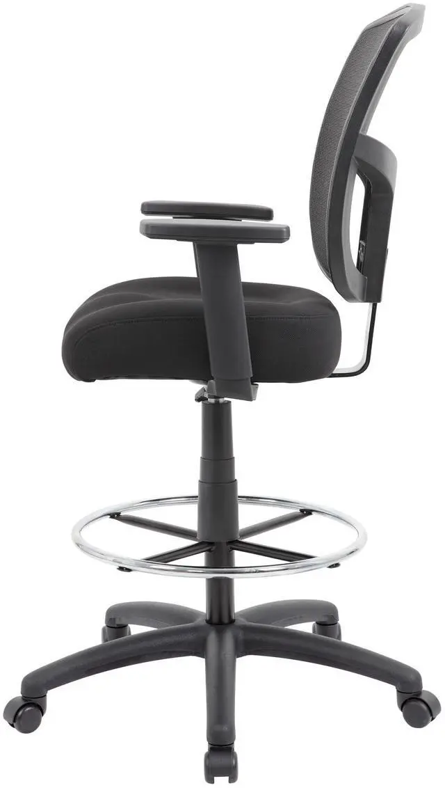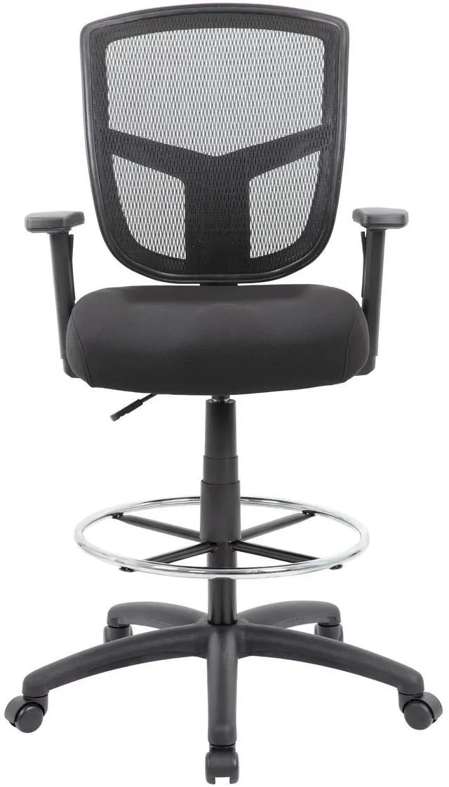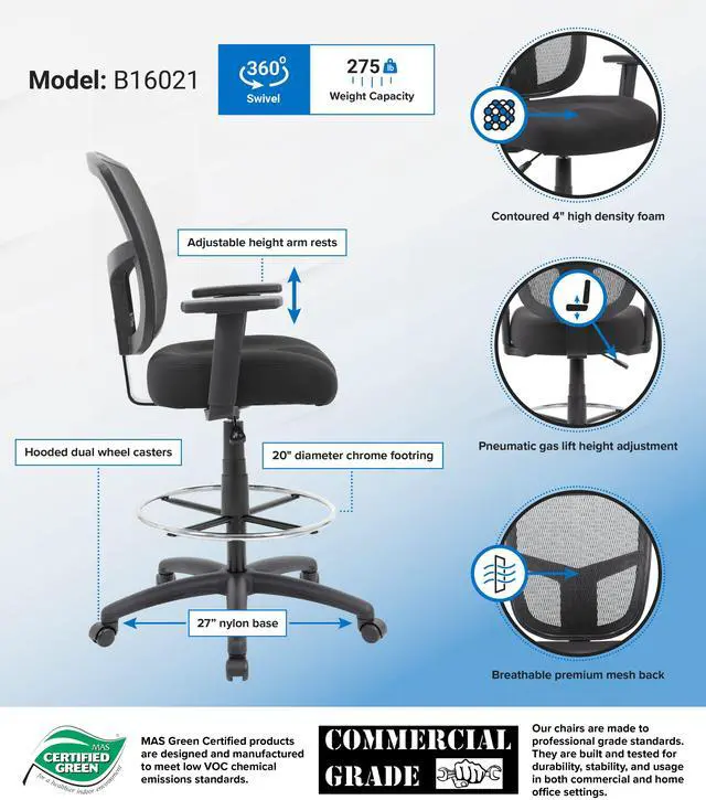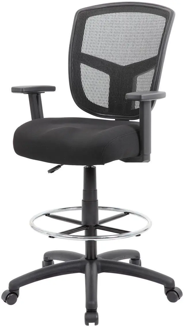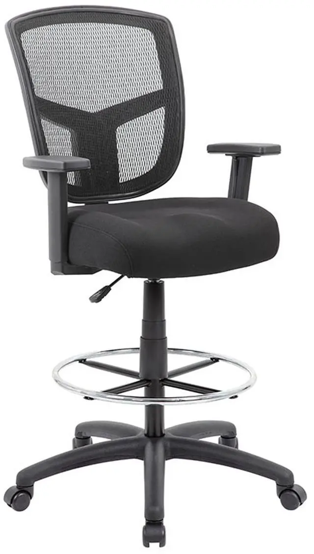 Contract mesh drafting stool. Breathable premium mesh back. Adjustable height armrests. Contoured 4" high density foam seat cushion. Pneumatic gas lift seat height adjustment. 20" diameter chrome footring. Large 27" black nylon base. Hooded double wheel casters.