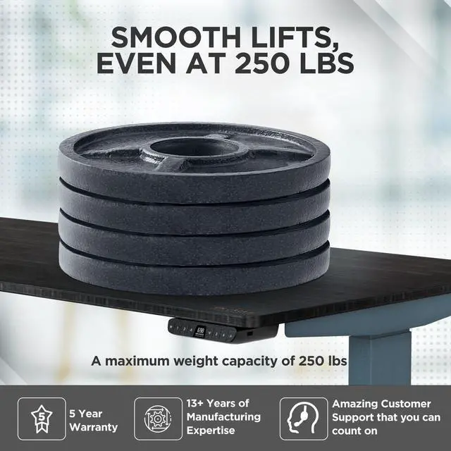 The dual motor standing desk frame lifts up to 250 lbs, safely moving virtually any office load. Upgrade your home office desk with an electric adjustable desk that's built to last. Our electric adjustable standing desk has been field tested since 2010 and comes with a 5 year warranty. The electric height adjustable desk is backed up with outstanding customer support that treats everyone like family. Our adjustable office desk comes with a beautiful bamboo desktop that securely mounts to the adjustable height standing desk frame. Whether you're looking for a small office desk, adjustable gaming desk, this motorized standing desk is perfect for you.
