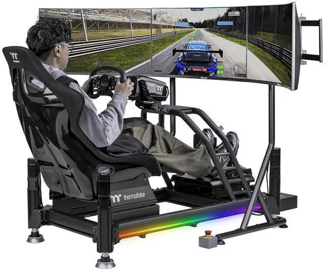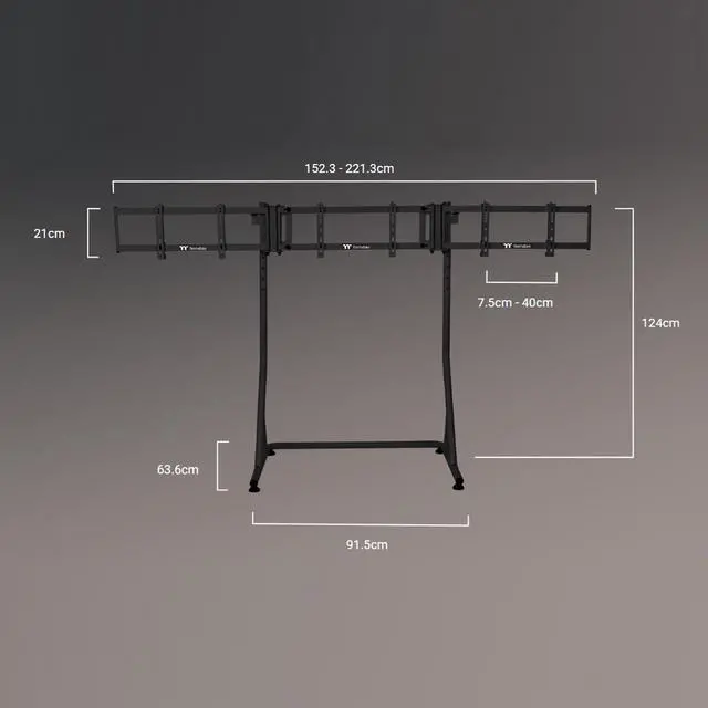 Built for an immersive experience compliment your simulator set up with the Triple Racing Monitor Stand Pro, made from powder coated steel for durability. Height adjustment and the wide base makes this a great addition for simulators, as well as those with motion systems. VESA mounting makes installing a display easy and straight forward with multiple VESA sizes supported. Single monitor configuration supports up to 55 and triple configuration up to 32 curved and 34 flat is supported.
