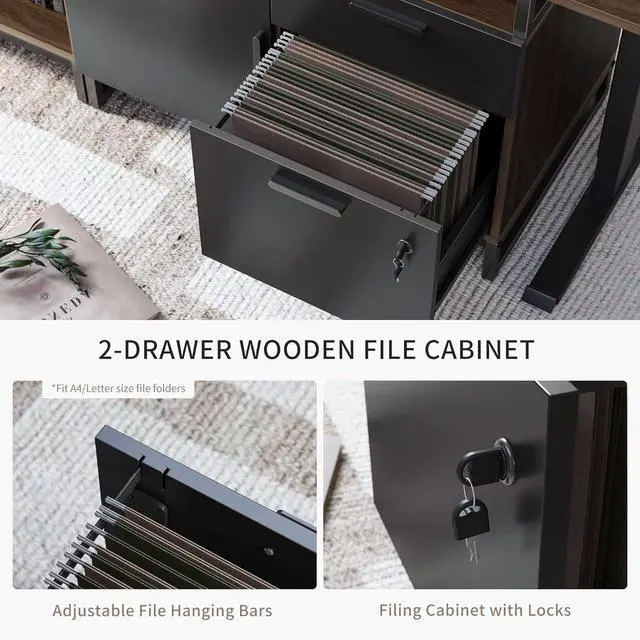 The filing cabinet with 2 drawers keeps hanging legal/letter/A4 size files, the open storage shelves are designed to keep your office machines, paper and supplies organized.