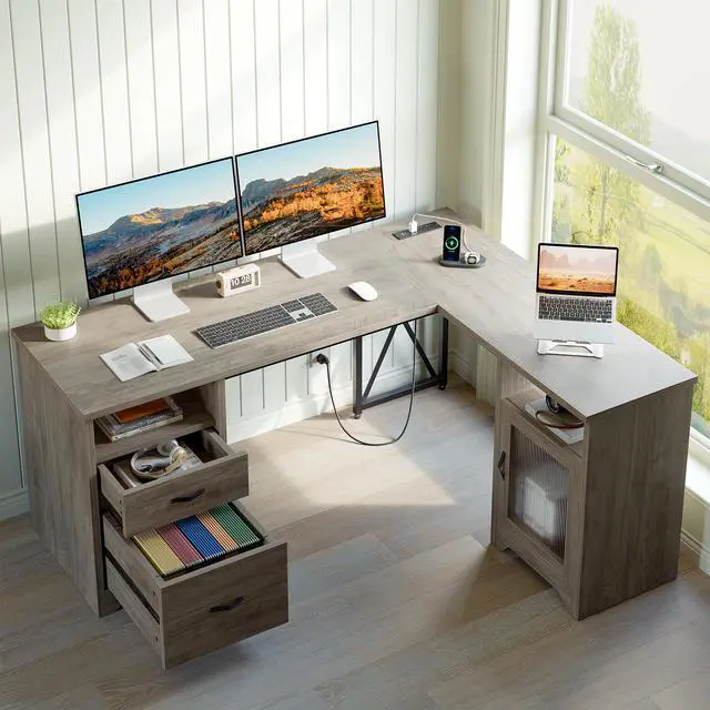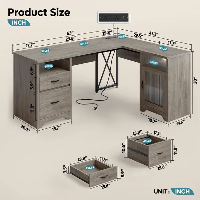 Introducing our versatile farmhouse-inspired studio desk, designed to transform your workspace with its blend of functionality and rustic charm. Two reinforced pedestals provide ample storage and stabilityoffering open cubbies, a utility drawer, an adjustable-rail file drawer that accommodates A4, Letter, and Legal folders, plus a dust-resistant fluted cabinet that beautifully conceals taller items behind semi-transparent panels. Built directly into the desktop youll find three AC outlets, one USB and one Type-C porteliminating the need for extra power stripswhile a 4.9-foot power cord ensures you can position the desk anywhere you like. Crafted to support up to 200 lbs on the surface and hefty loads in the drawers, this desk remains rock-solid even under dual monitors, heavy printers, or stacks of binders. Offered in Rustic Brown and Wash Gray finishes that highlight authentic wood-grain textures and accented with tactile black V-shaped handles, it brings an inviting warmth to any home office or creative studio. Plus, the three-piece desktop design, clear instructions, and labeled parts mean two people and a power drill can have it fully assembled in no time.