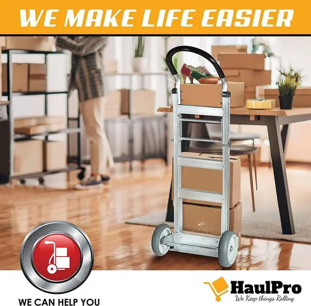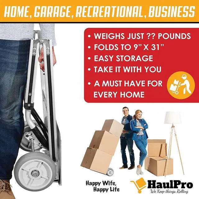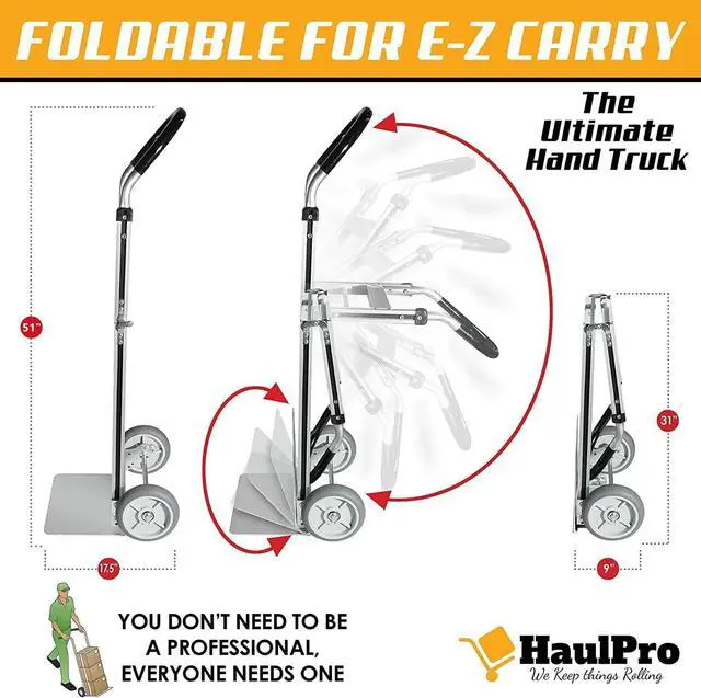 &: Professional movers, delivery drivers, factory workers, and at-home tinkerers love the design and durability of this push cart dolly. Its 8" mold-on rubber wheels on die-cast hubs with semi-precision bearings and has a sturdy 14 x 7.5" extruded aluminum nose plate. Frame and nose plate fold to reduce this hand truck's size during storage and transport.