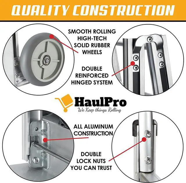 -: On the rare occasion a part needs to be replaced, it is easy to do on this moving dolly. The modular design means that there are no welds to break. The frame on this hand cart is made from industrial-grade aluminum that is tough as nails. The 8-inch Mold On rubber wheels is designed to last a lifetime. Do not miss the opportunity,