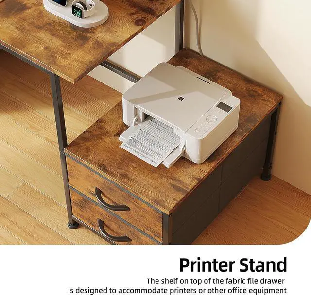 Reversible Desk with Printer ShelfThe side shelf with 2 drawers can be installed on the left or right side according to your using habits. With a depth of 18.9 inches, the auxiliary desktop space offers ample room for professional printers or pc case, also can place office essentials like keyboard and notebook within easy reach