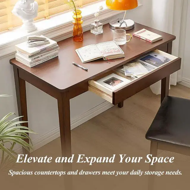 Flexible and Space-Efficient: Our computer desk offers two size options35.4 inches with a single drawer, and 47.2 inches with two drawers. This wood desk transforms any corner into a productive or creative oasis. Whether it's a snug area for study table, a dynamic home office desk, or a vanity, it shifts roles effortlessly. Despite its compact footprint, this modern desk provides sufficient workspace without crowding your area.