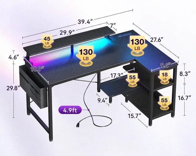 ODK 40 Inch Gaming Desk with USB Power Outlets and LED Lights, Reversible L Shaped Computer Desk with Storage Shelves & Monitor Stand, Corner Home Office Desk Table, Carbon Fiber Surface, Black
