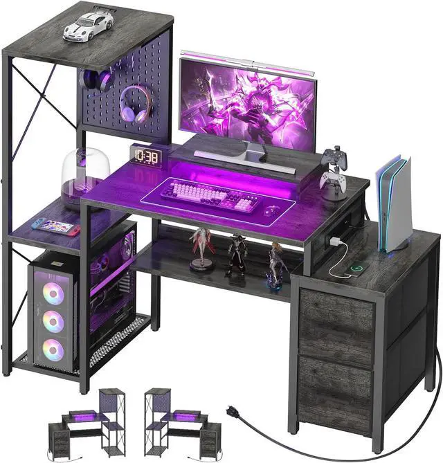 Small Gaming Desk with 2 Fabric Drawers - Reversible Computer Desk with Power Outlet & LED Lights, 49" Office Desk with Monitor Stand & Storage Shelves, Writing Study Table with Pegboard, Grey Oak