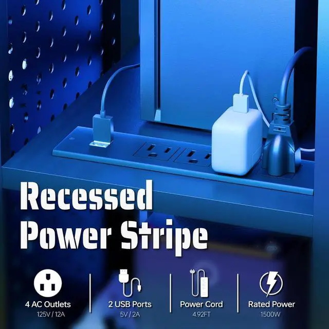 What You Get : A compact, movable gaming desk equipped with a power outlet, LED lights, a headphone hook, a cup holder, and a pegboard. Enjoy easy mobility and versatile use. This desk is the perfect ideal for small spaces, creating a functional and stylish home setup.The desk is USPTO Patent Approved.