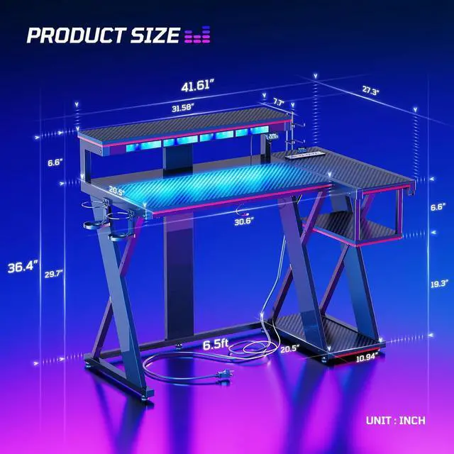 PC Gaming Desk with Power Outlet: Features 3 AC outlets + 1 USB +1 Type C charing ports. Rated Power: 1500W; AC Outlet: 120V/12A; USB Port: 5V 2A. Enjoy the convenience of built-in power outlets right on your desk, perfect for powering up your gaming equipment, charging your devices, keeping and you in the game without interruption