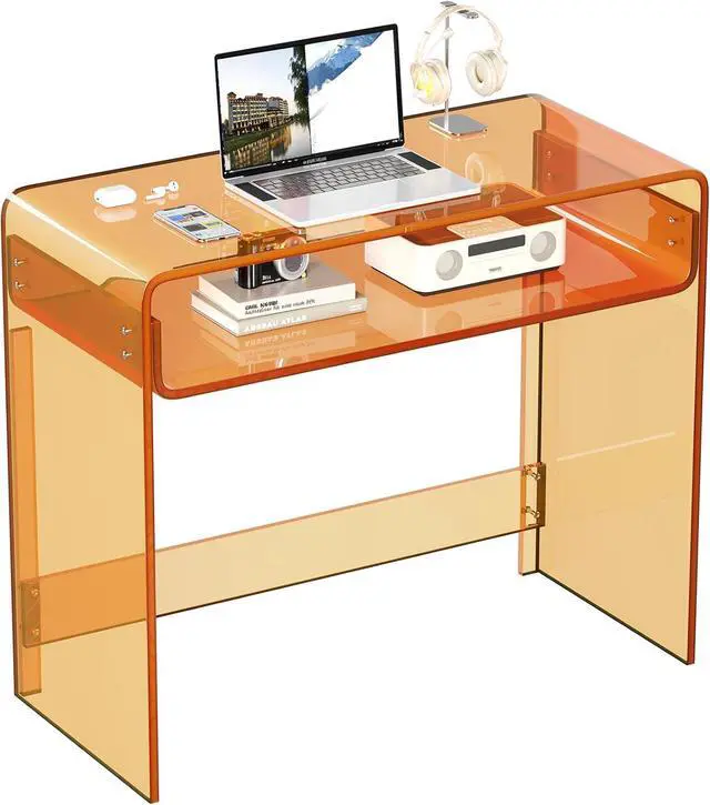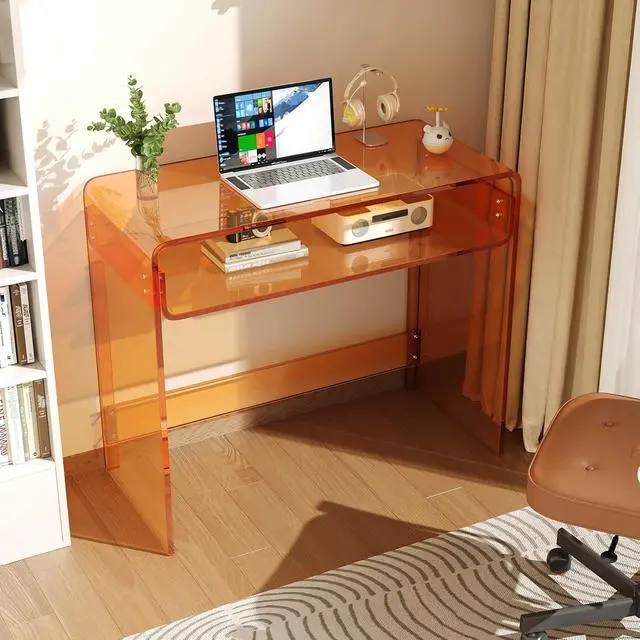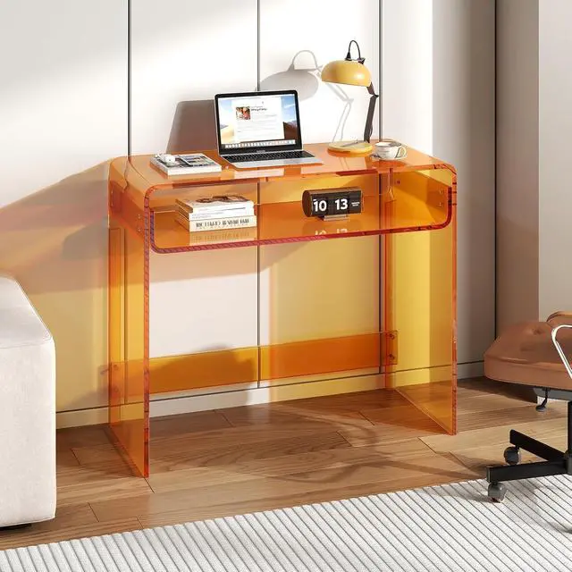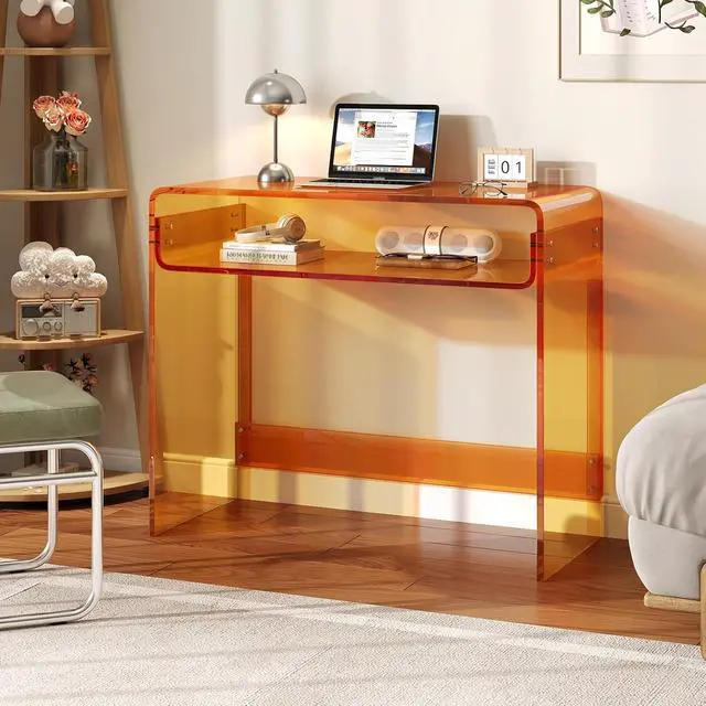Acrylic Office Desk, Modern Laptop Writing Study Table with Open Storage, Orange Console Entryway Table, 33.5" L x 15.8" W x 29.5" H, for Home, Bedroom