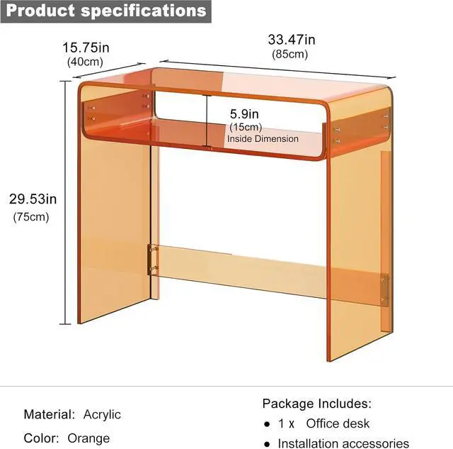Stylish and Minimalist Design The assembled size of writing and study desk is 33.5 " length x 15.8" width x 29.5 " height, which is suitable for placing desk lamp, laptop, clock. The edge and corner of desk have made polishing treatment to avoid cuts and grazes. The transparent acrylic desk can make it easy for you to find items you need.