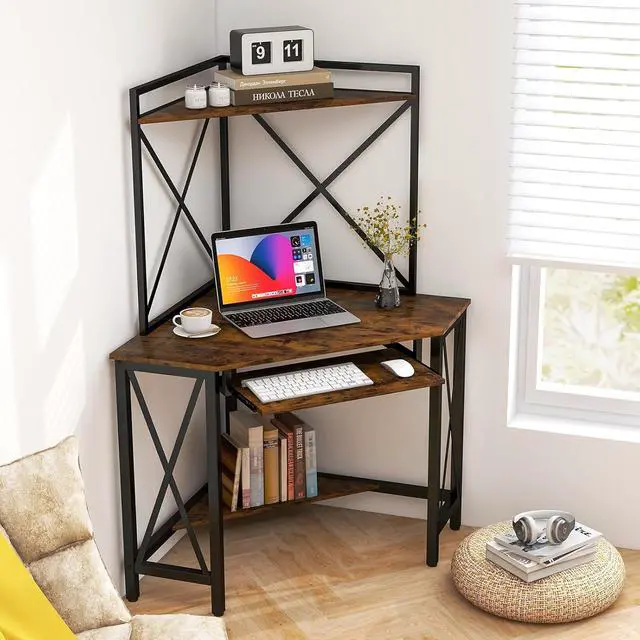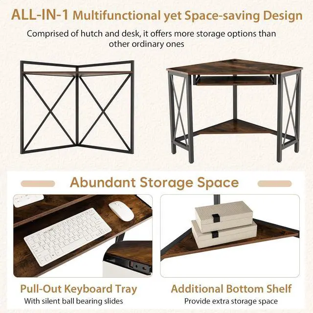 Tangkula Corner Desk with Hutch & Charging Station, Space-Saving Computer Desk with Shelves & Keyboard Tray, Triangle Home Office Desk with Metal Frame, Corner Desk for Small Space