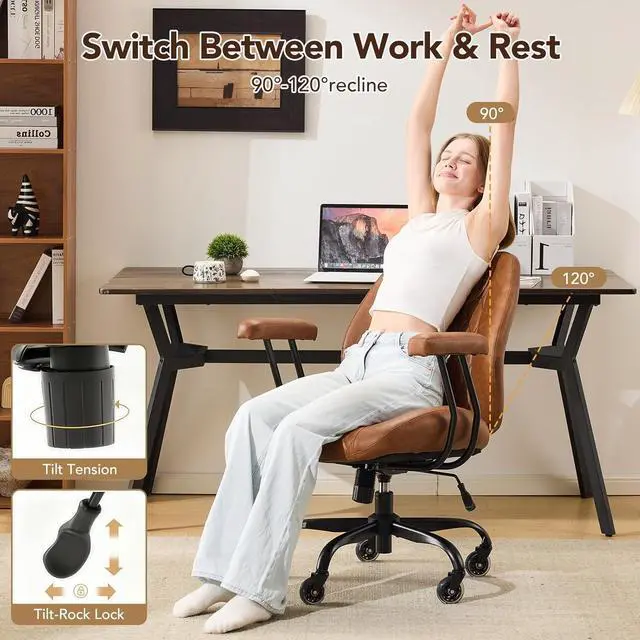 YFO Home Office Desk Chair Office Rubber Casters Ergonomic Computer Chair with Lumbar Support Adjustable Height Rolling Swivel Executive Task Armrests Chair, Brown Leather